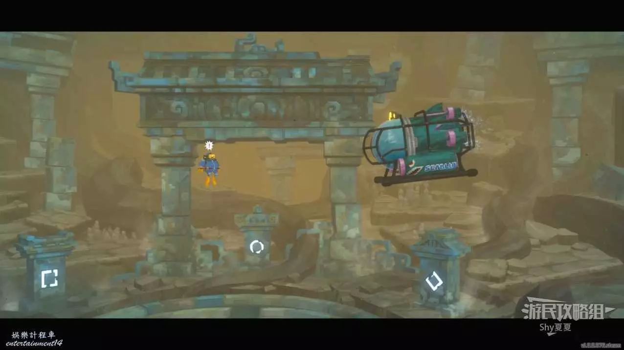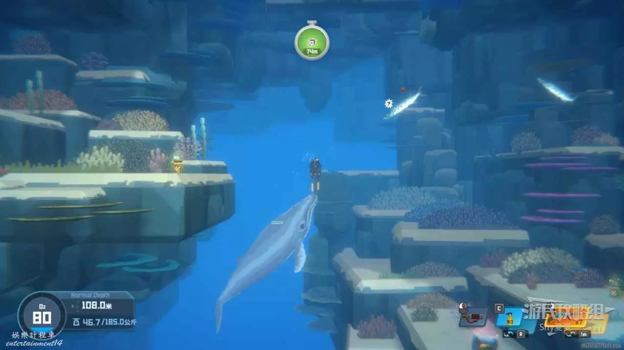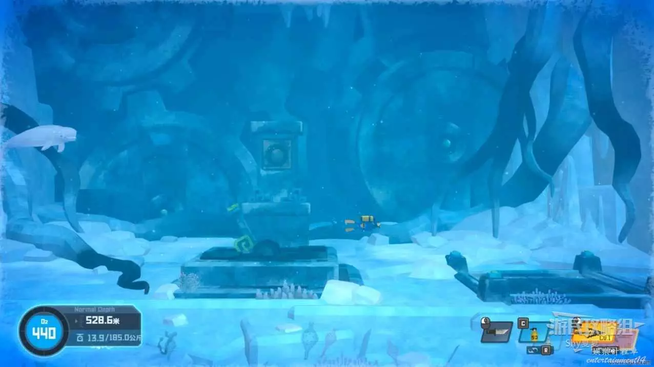 來到第二個裝置入口,白鯨出現,乘坐白鯨前進,可以使用突進攻擊,可以失誤3次,但是可以使用水中的蝦回血。