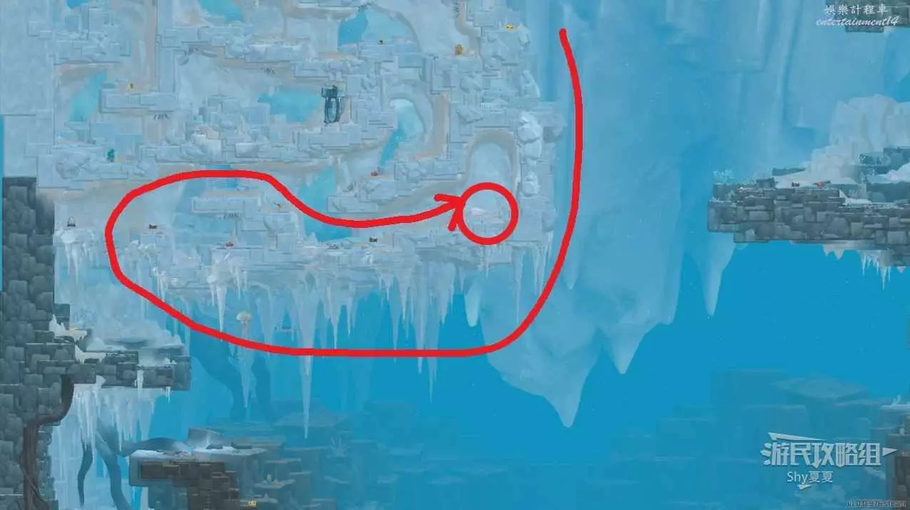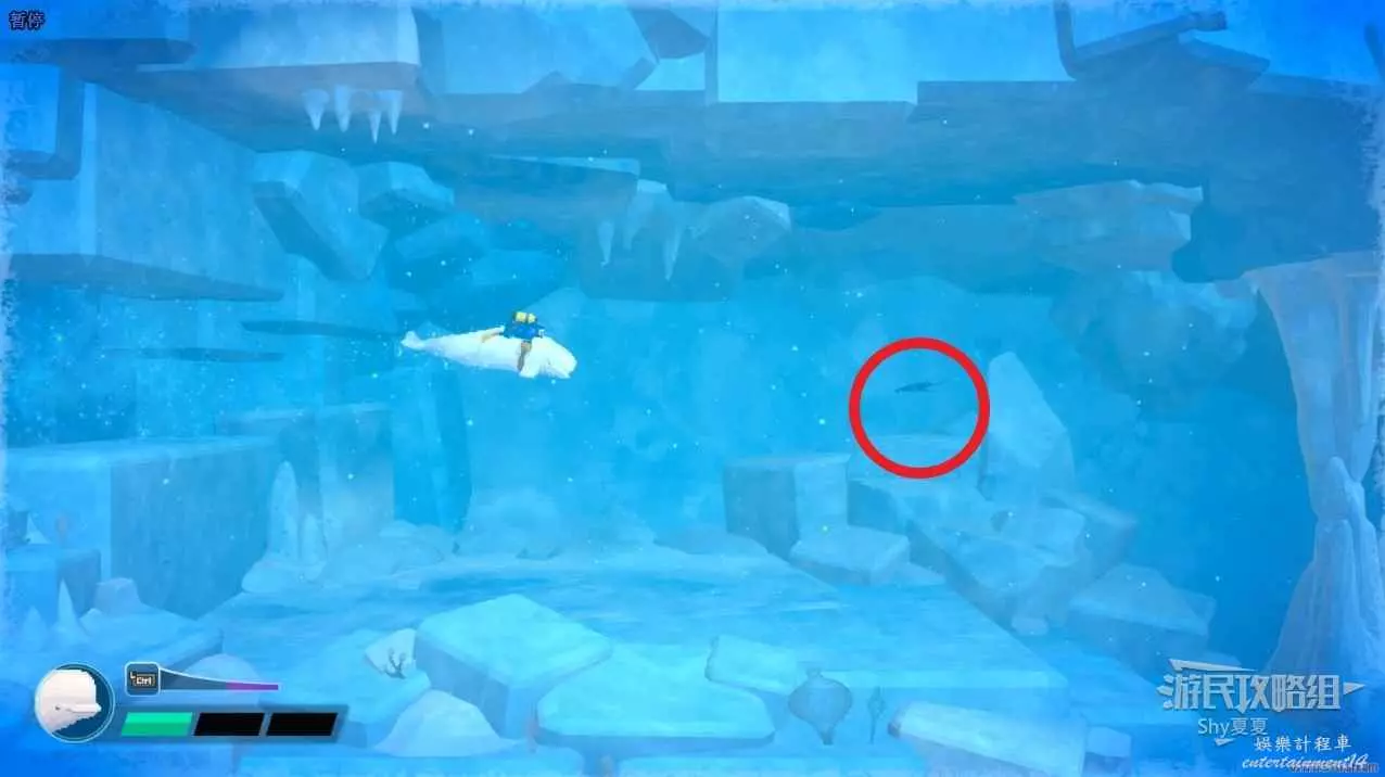 再次前往冰河區域,一直往下走,玩會看到多個冰錐的位置向左,按照下圖路線走就能看到白鯨。