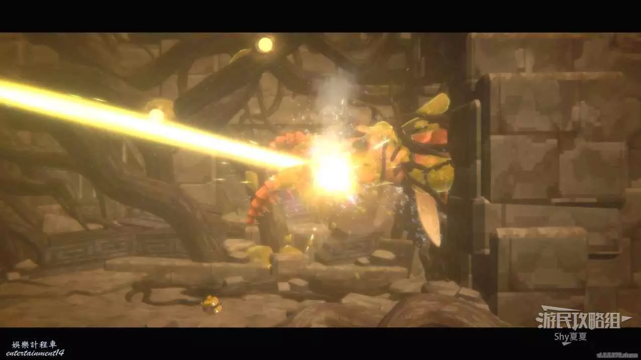 利用子彈進行設計,躲避彈幕即可。二階段可以用鐳射炮,傷害很高,可以配合緩慢使用。第三階段是追逐戰,也是用鐳射炮對付,紅色飛蟲可以直接站在一個位置就不會受到傷害,但是要小心BOSS的鐳射。第四階段是向上跑,躲避BOSS噴火就行。最後切玩QTE,就準備通關吧!