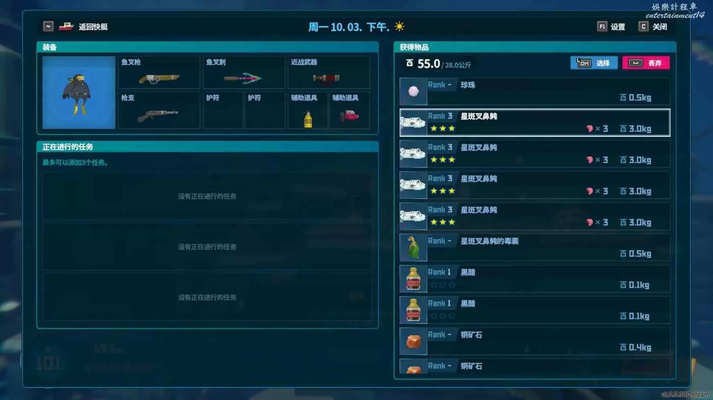 首先要注意,前期負重太少,第四天之前,除了任務要求的垃圾和銀碟以外都不要撿,就連礦都可以不挖,因為商店開啟的時候我們已經不缺錢了!前期空間留給賣價高的魚,儘快升級負重。