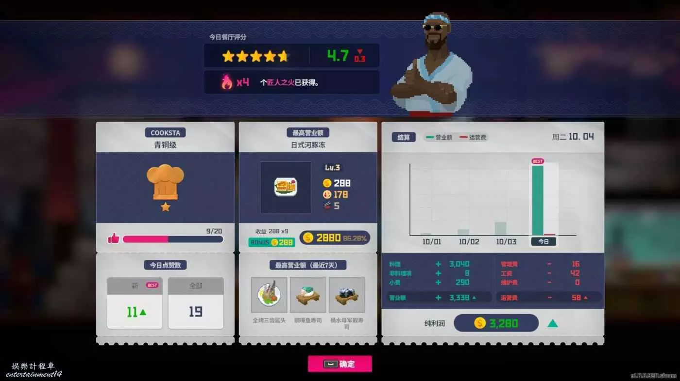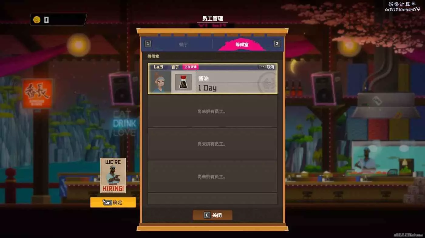 可惜,運氣不太好,跑了一個顧客。但是沒有關係,今天必能升級4級河豚凍。我們現在很有錢,留一點給員工招募,升級拉滿。