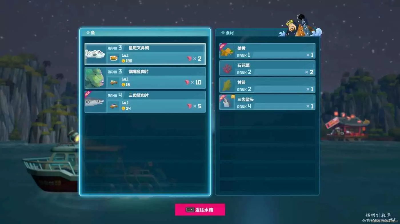 賣魚升級深度到130m,開出睡眠魚叉,爽,順便確定了地圖右側70m深的洞窟裡必定刷大量河豚,叉完去撈虎鯊,爽上加爽。