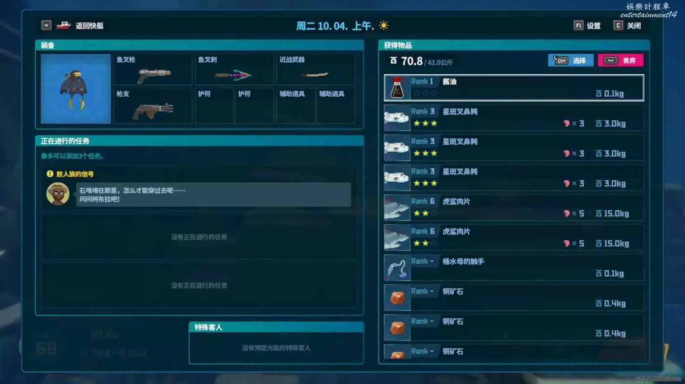 今天負重升級到了42kg,可以隨便撿垃圾了,只要保證河豚全收調料全收,最後留2kg給虎鯊就行。