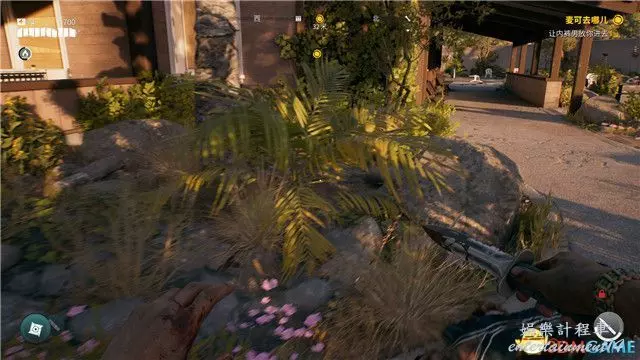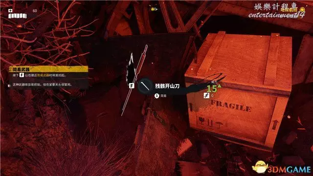 劇情升級後,你需要拾取另外一把武器,然後使用瞄準+投擲的技能,將懸崖上的車輪打下來。