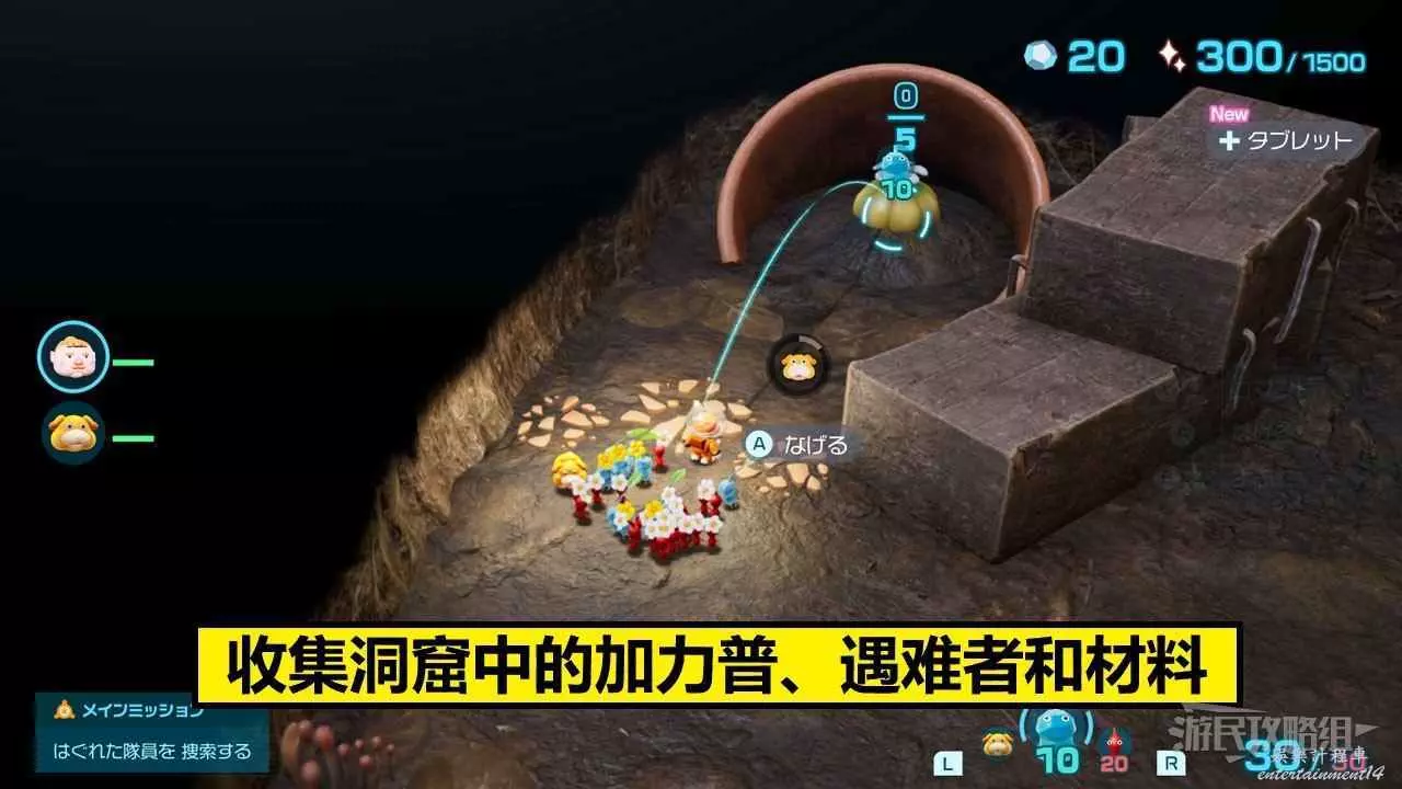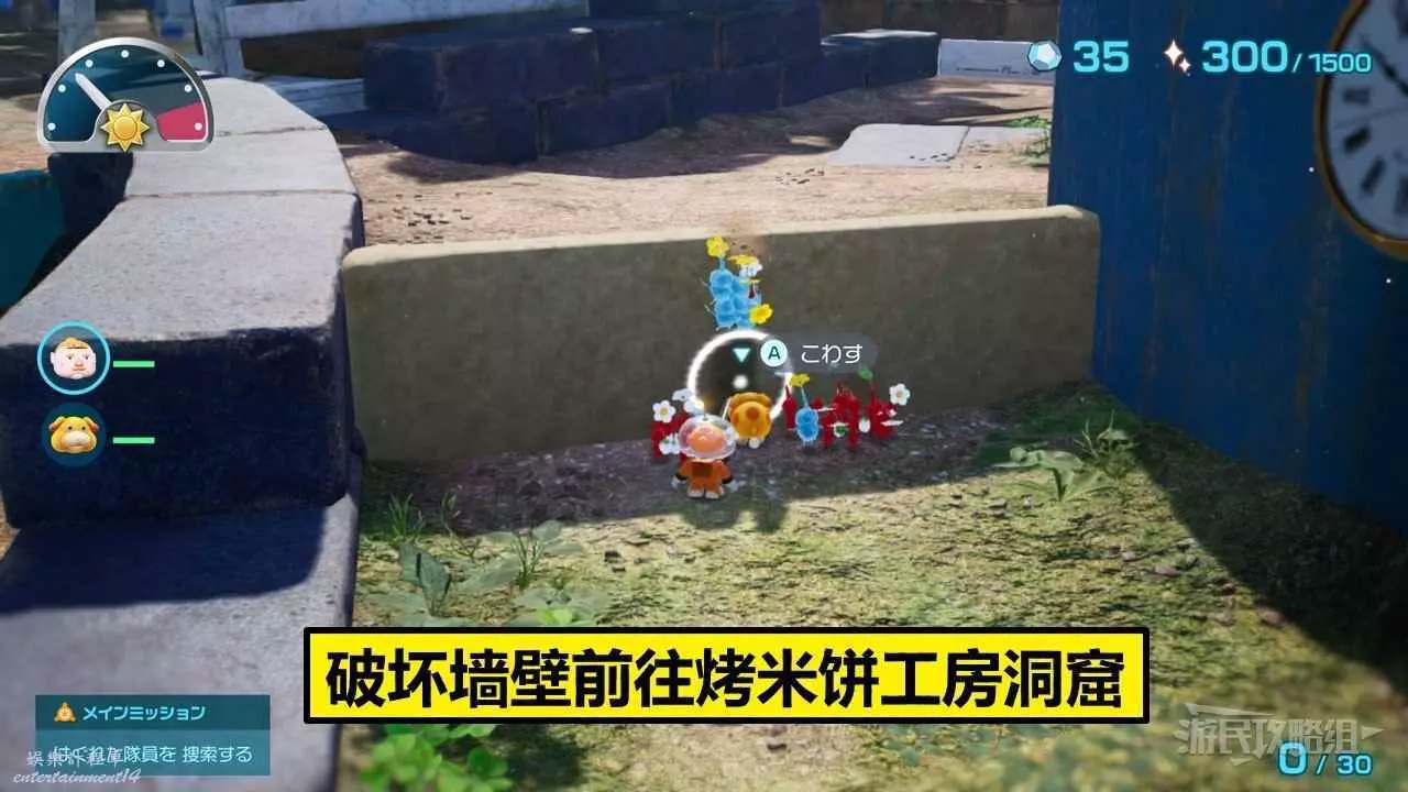 破壞中間的土牆,前方可以發現洞窟「烤米餅工房」,完全探索此洞窟,裡面有20只黃色皮克敏,只留下原生生物即可。