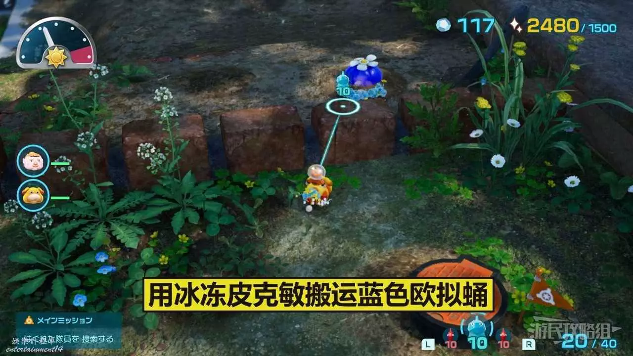 如果當天時間還有剩餘的話,可以先去收集藍色歐擬蛹。從洞窟「小試牛刀之戰」所在位置西側直接扔出冰凍皮克敏,讓它們搬運藍色歐擬蛹即可。