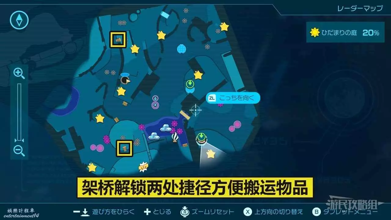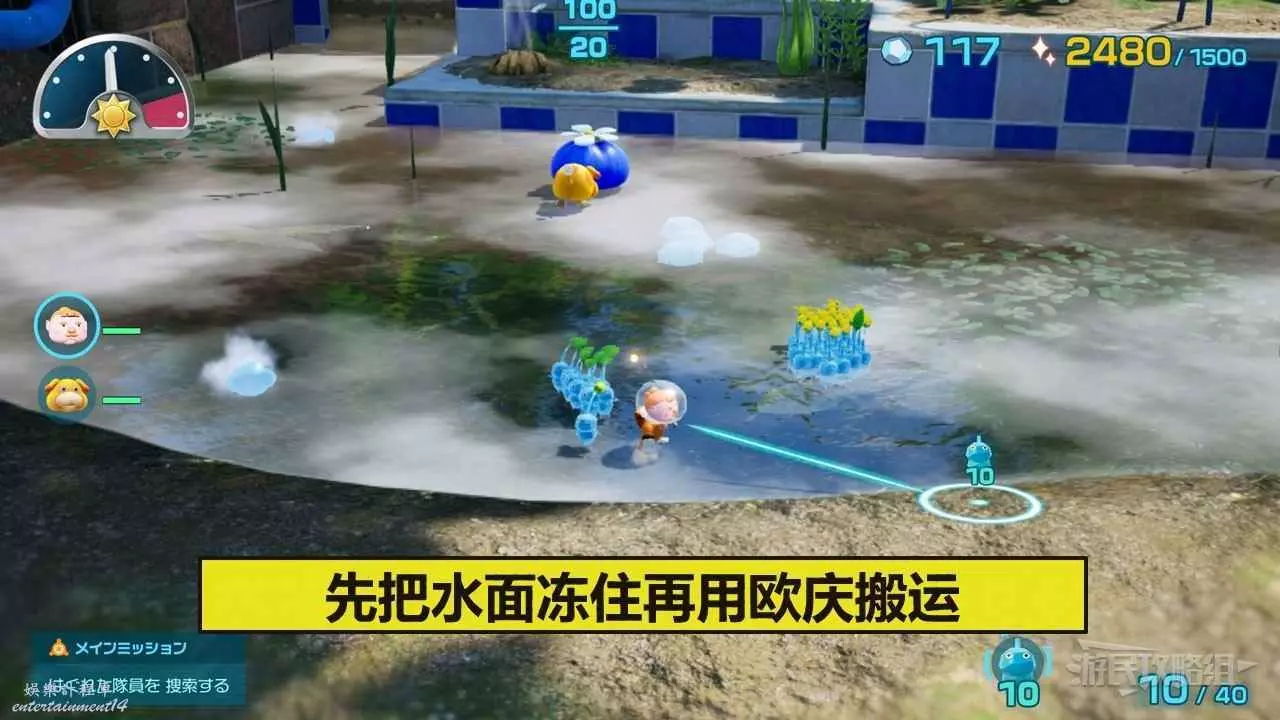 在南北兩邊架2座橋,解鎖搬運寶物的近路,由於需要40只皮克敏,建議分成每組20只同時進行。