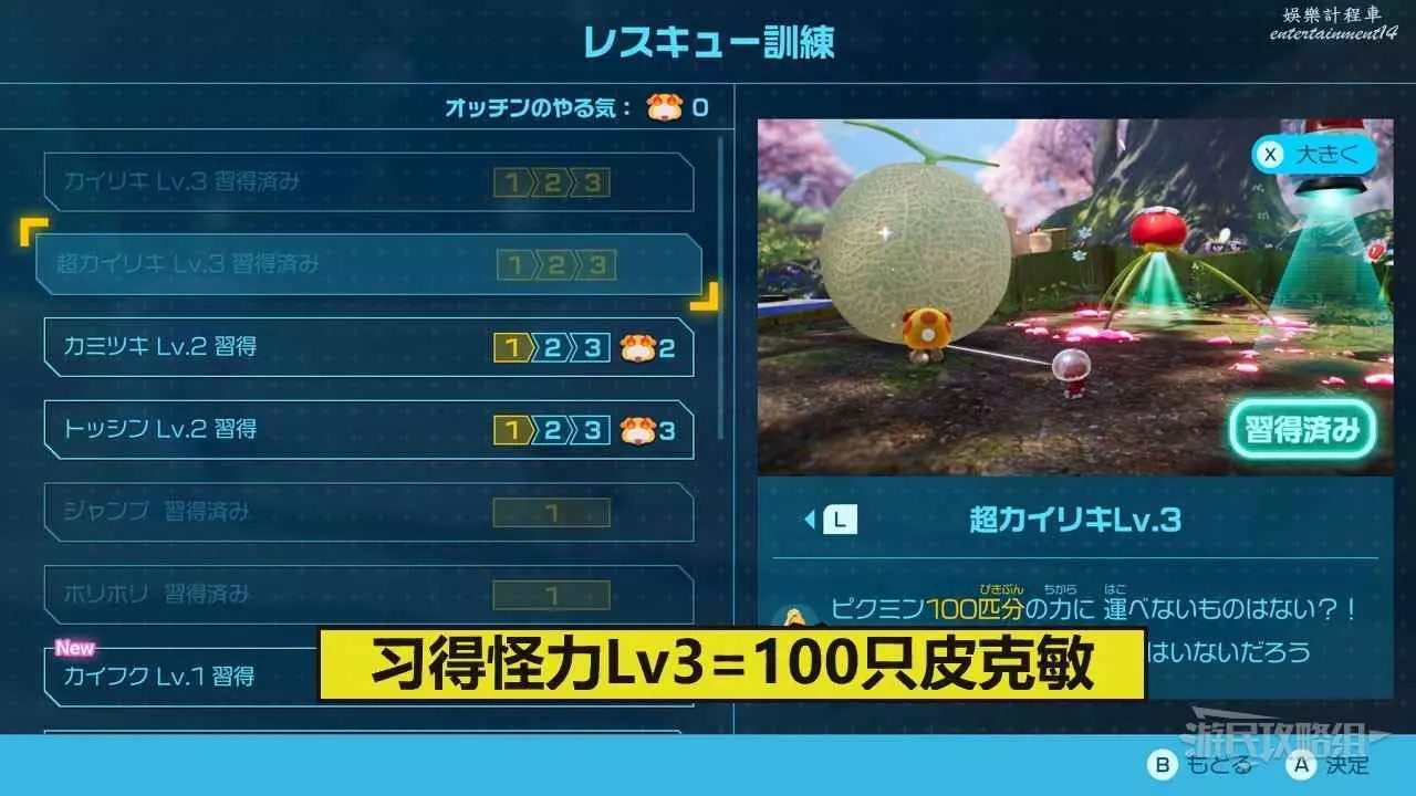 達成100調查率需要找到所有獲救者(共7人)、寶物(共37個)和歐擬蛹類(共4種)。試玩版只要收集到1500能量就會通關,所以關鍵是在最後一天再完成洞窟探索和寶物收集,具體流程建議參考下方表格,在第四天即可完成100%。