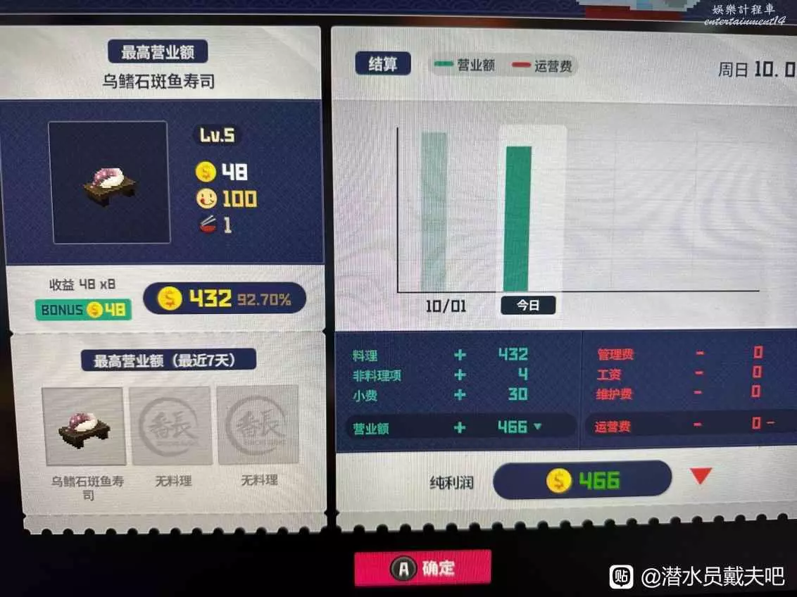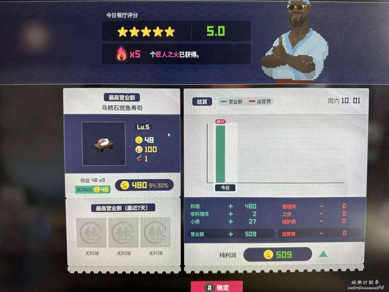 注意老頭會白嫖你一份菜,所以第一天晚上先準備一份藍倒吊壽司給他,然後準備9份石斑魚壽司迎客,第一天收入509。