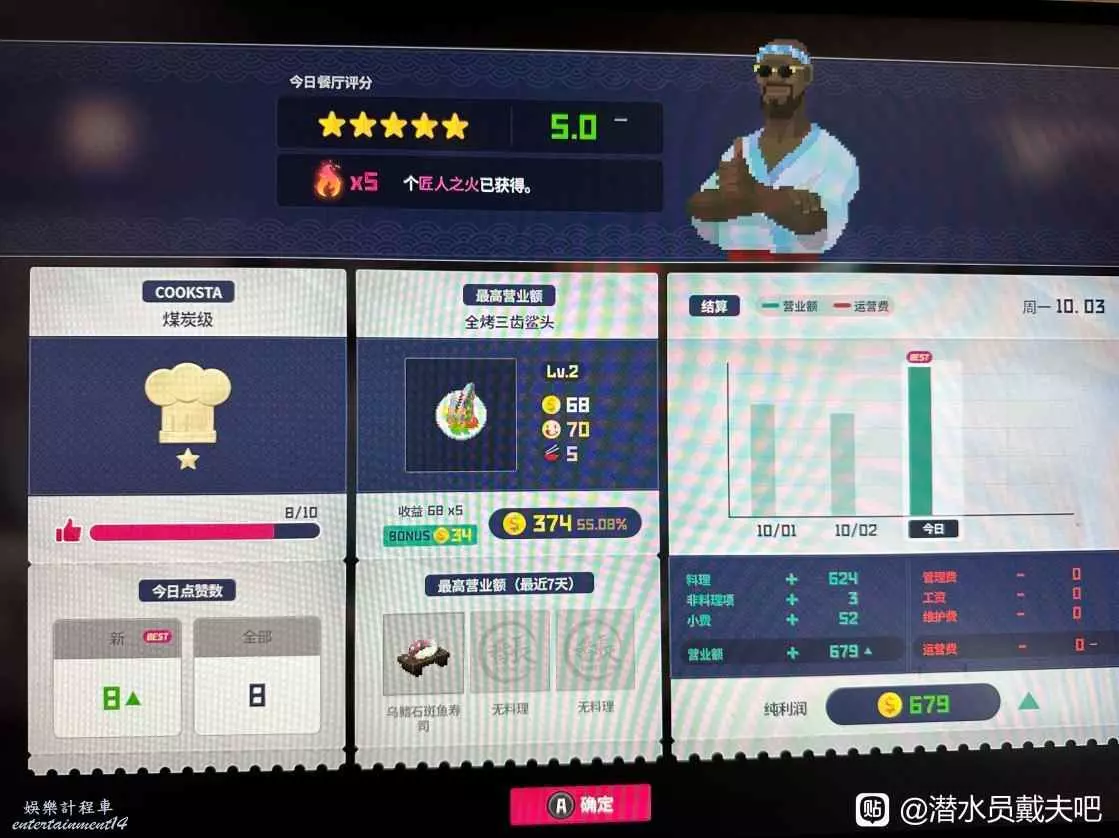 10月3號晚上,全烤三齒鯊頭升2級並賣一份5盤,此外賣三盤虎鯊壽司(不要升級,多的肉直接賣更賺錢)
