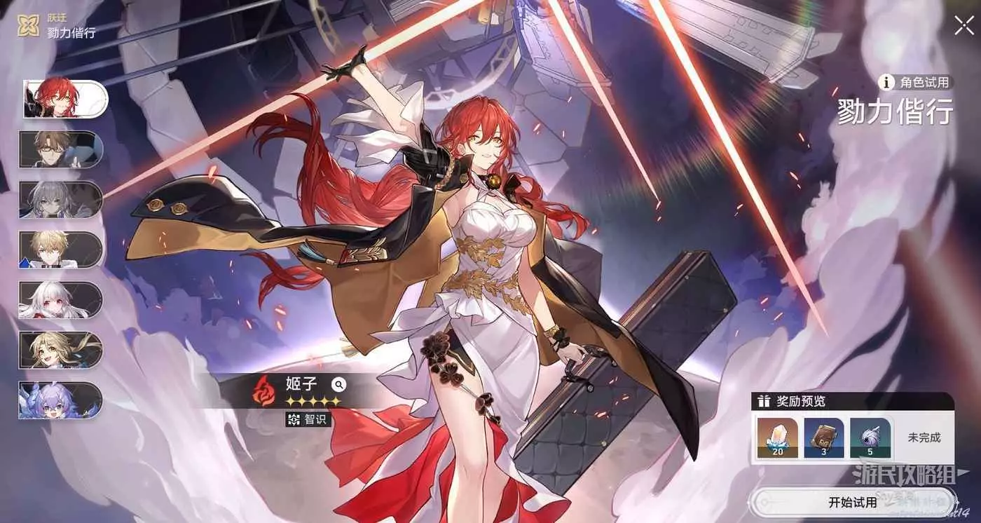 活動介紹:可試用角色「姬子(智識•火)」「瓦爾特(虛無•虛數)」「布洛妮婭(同諧•風)」「傑帕德(存護•冰)」「克拉拉(毀滅•物理)」「彥卿(巡獵•冰)」「白露(豐饒•雷)」體驗關卡,達成挑戰後,可獲得星瓊、冒險記錄、通用培養材料獎勵。