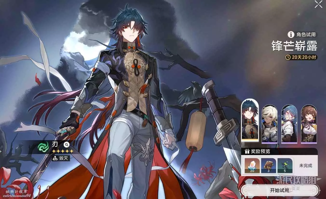 活動內容:可試用角色「刃(毀滅•風)」「阿蘭(毀滅•雷)」「娜塔莎(豐饒•物理)」「素裳(巡獵•物理)」體驗關卡,達成挑戰後,可獲得星瓊、冒險記錄、通用培養材料、信用點獎勵。