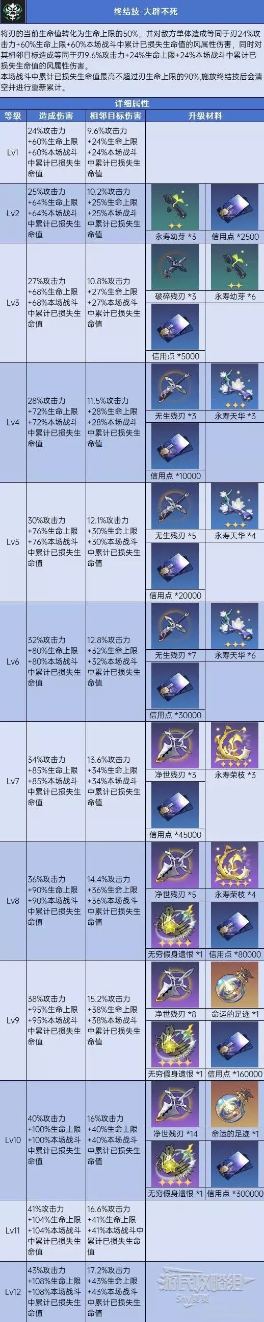1命-劍錄大限,地獄變相:終結技對指定敵方單體造成的傷害額外提高,提高數值等同於刃150%本場戰鬥中累計的已損失生命值。本場戰鬥中累計已損失生命值最高不超過刃生命上限的90%,施放終結技後會清空並進行重新累計。