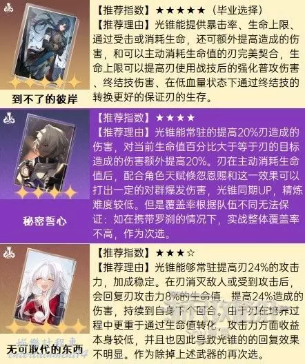 【推薦理由】目前版本契合刃的輔助角色為布洛妮婭和佩拉,在刃優秀的暴擊率/暴擊傷害面板下,布洛妮婭可以提供進一步放大增益效果,佩拉的群體減防能放大刃的擴散,追加攻擊對群傷害。羅刹的恢復效果和驅散極大提高隊伍生存能力。