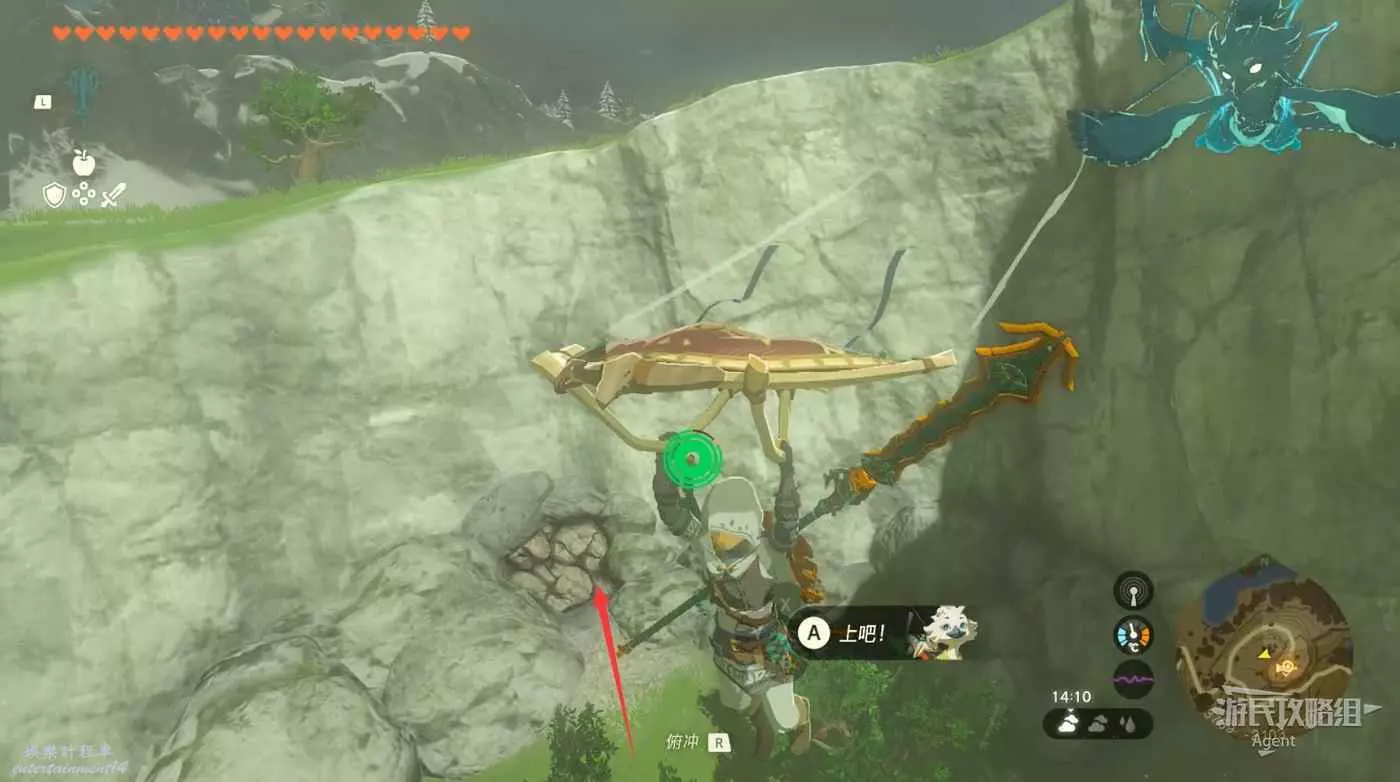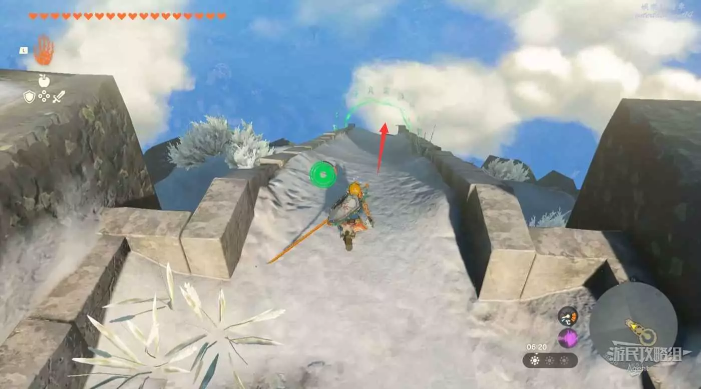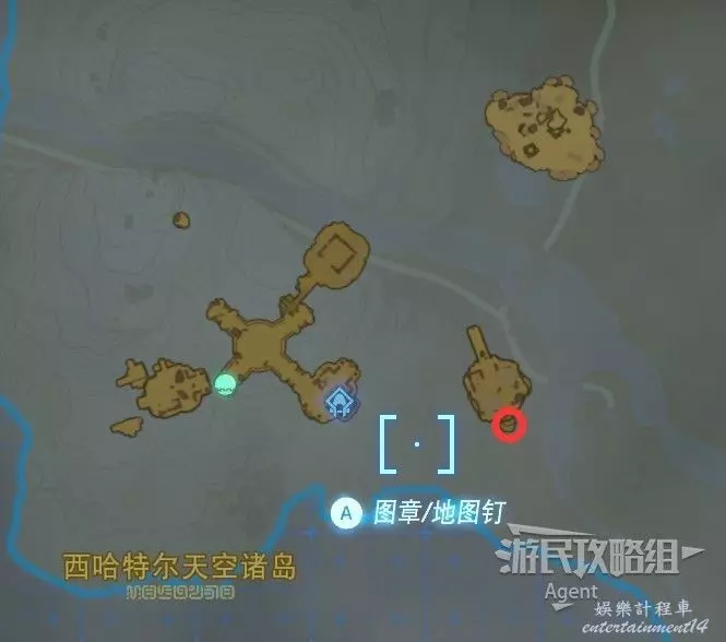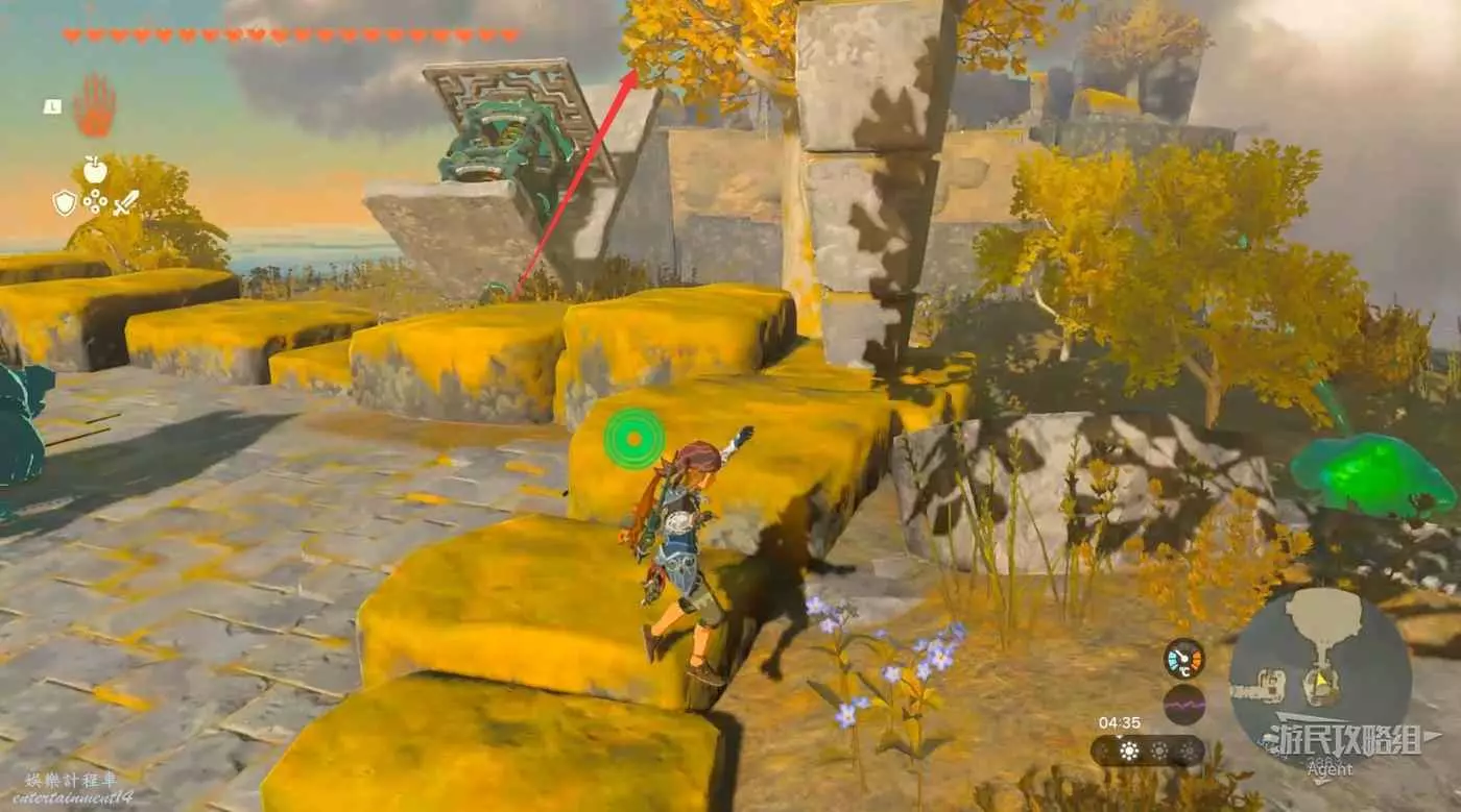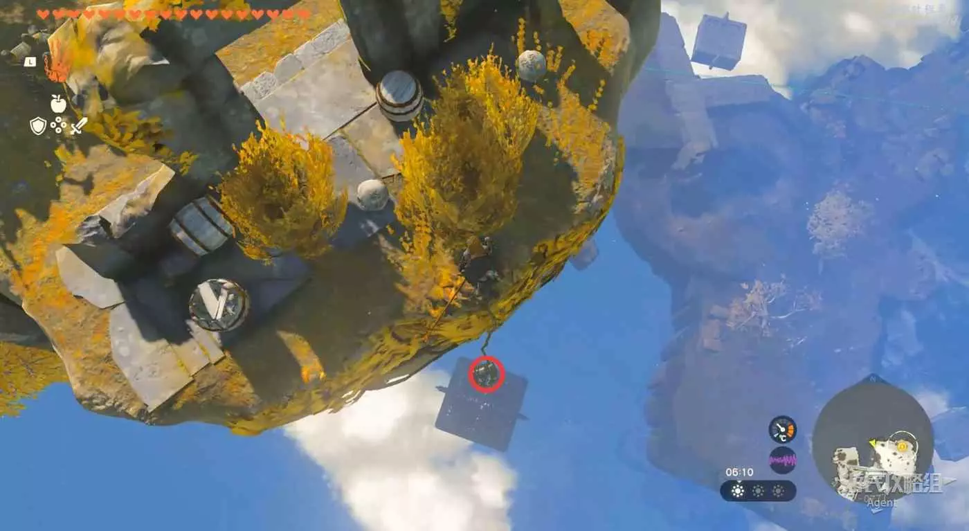 用彈射器然後用平臺上的火箭,到東北方最高島的頂部。下圖位置吊著個寶箱,往下跳空中拉弓射斷繩子,然後落下去開寶箱得到【殘舊的地圖】,在地底標出了藏特頭盔的位置。