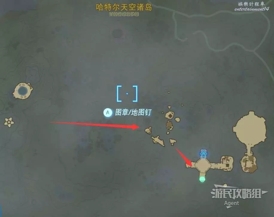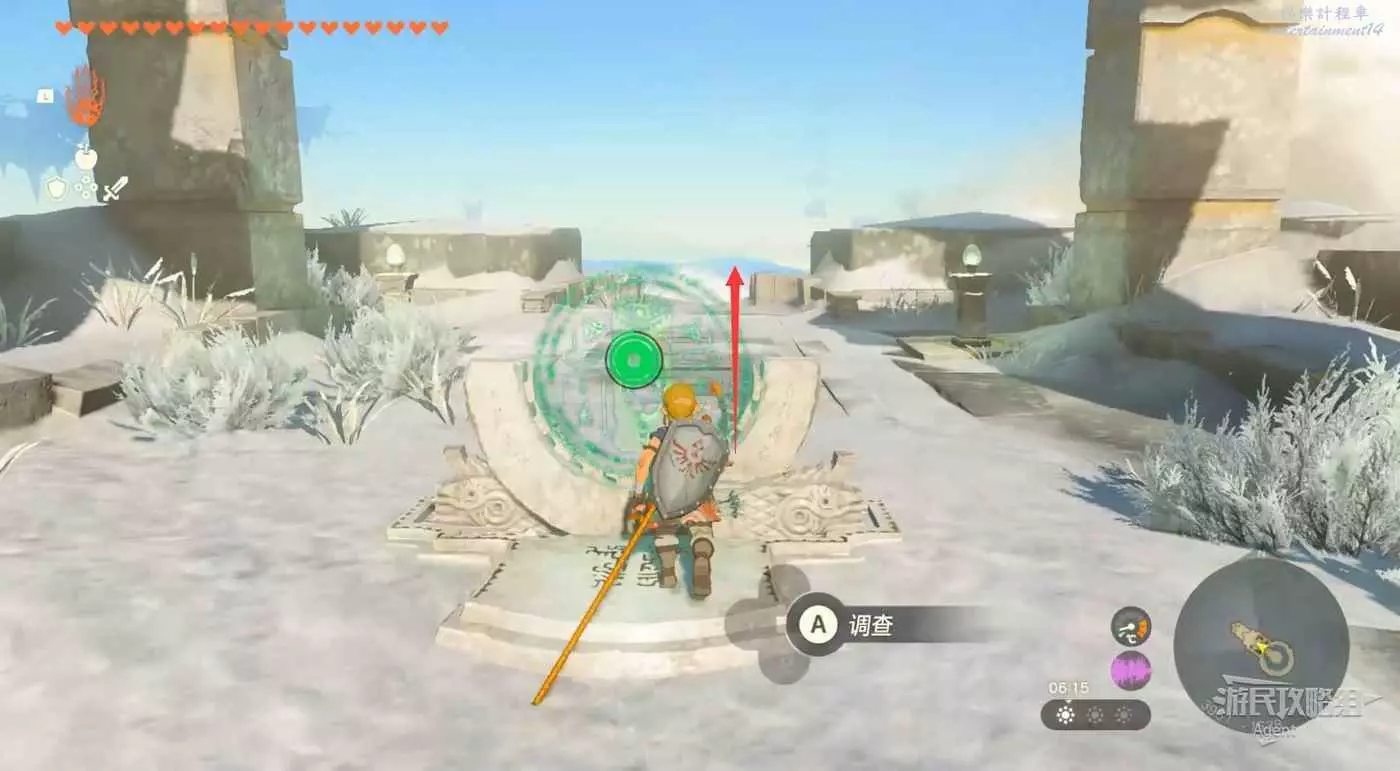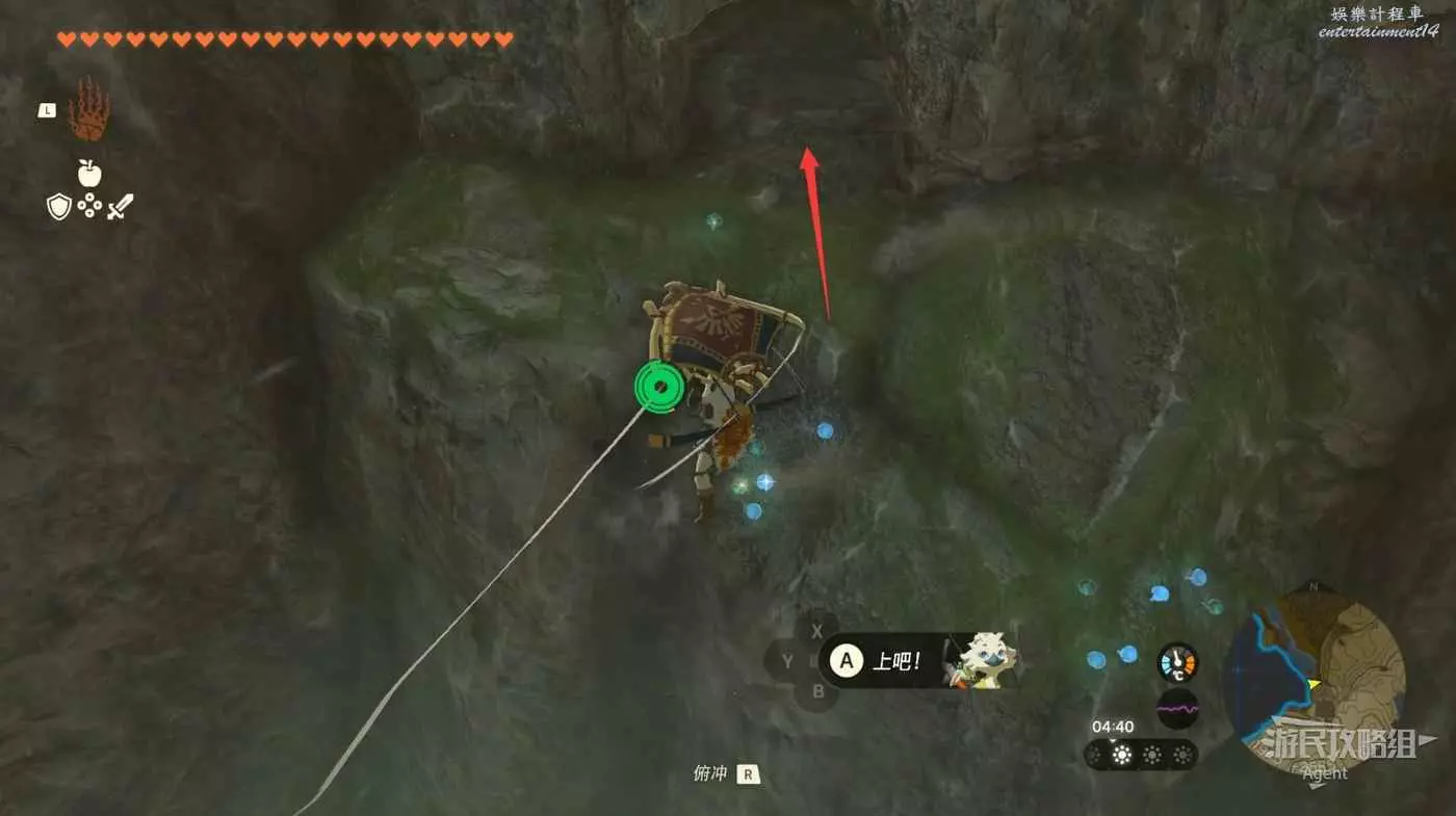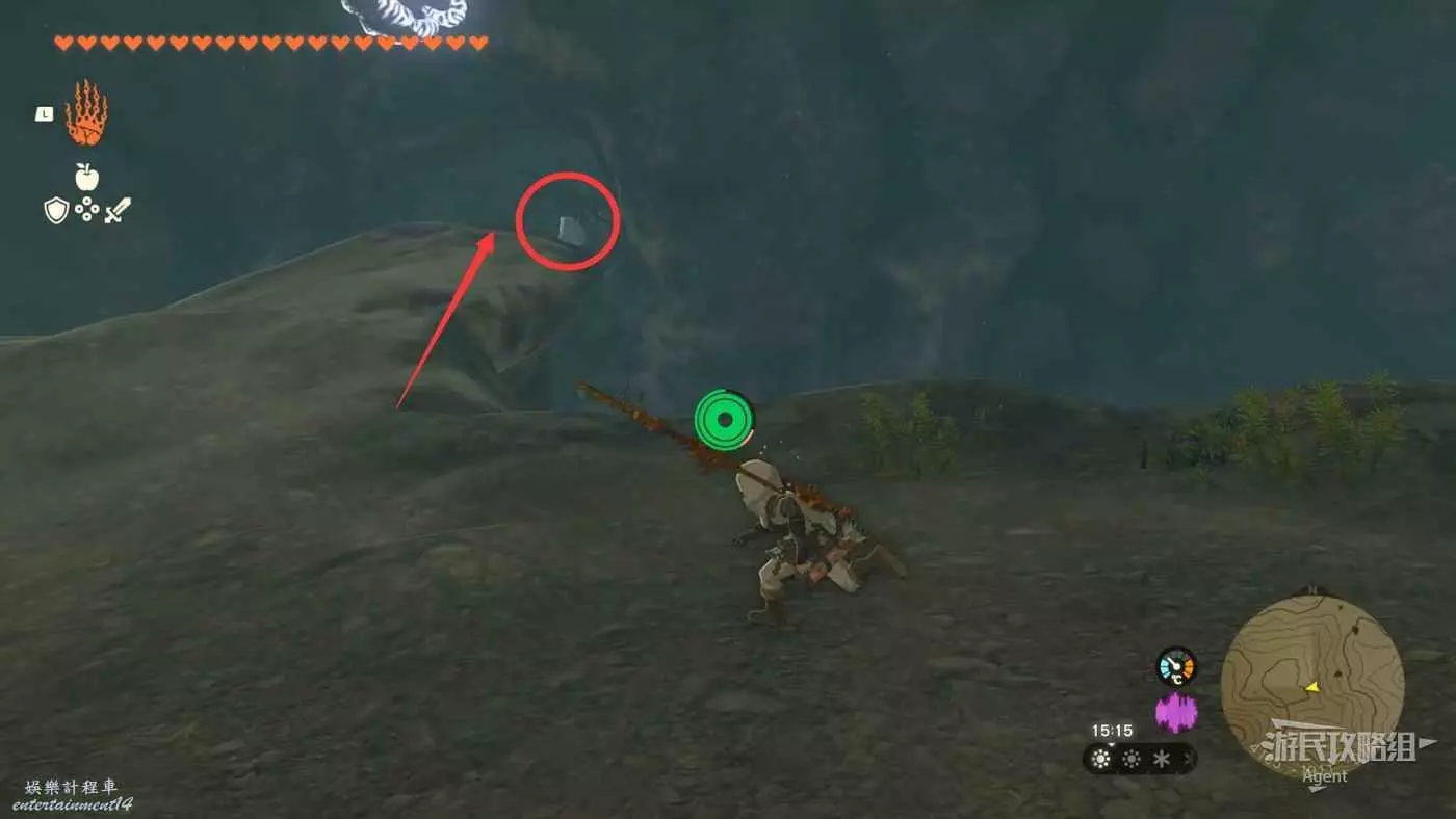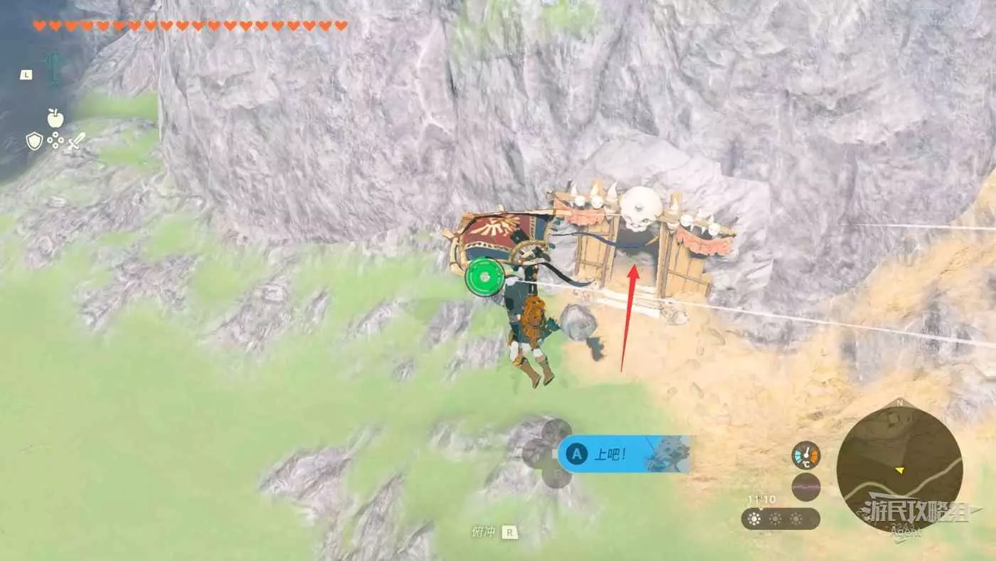 用彈射器然後用平臺上的火箭,到東北方最高島的頂部。下圖位置吊著個寶箱,往下跳空中拉弓射斷繩子,然後落下去開寶箱得到【殘舊的地圖】,在地底標出了藏特頭盔的位置。