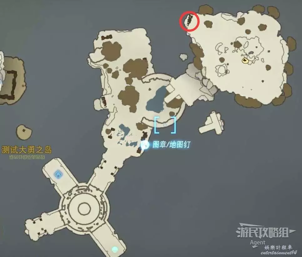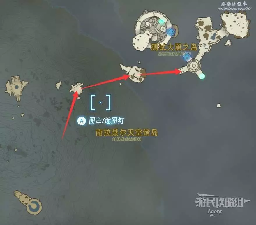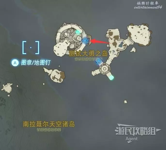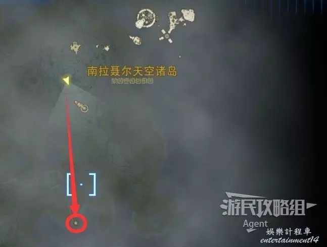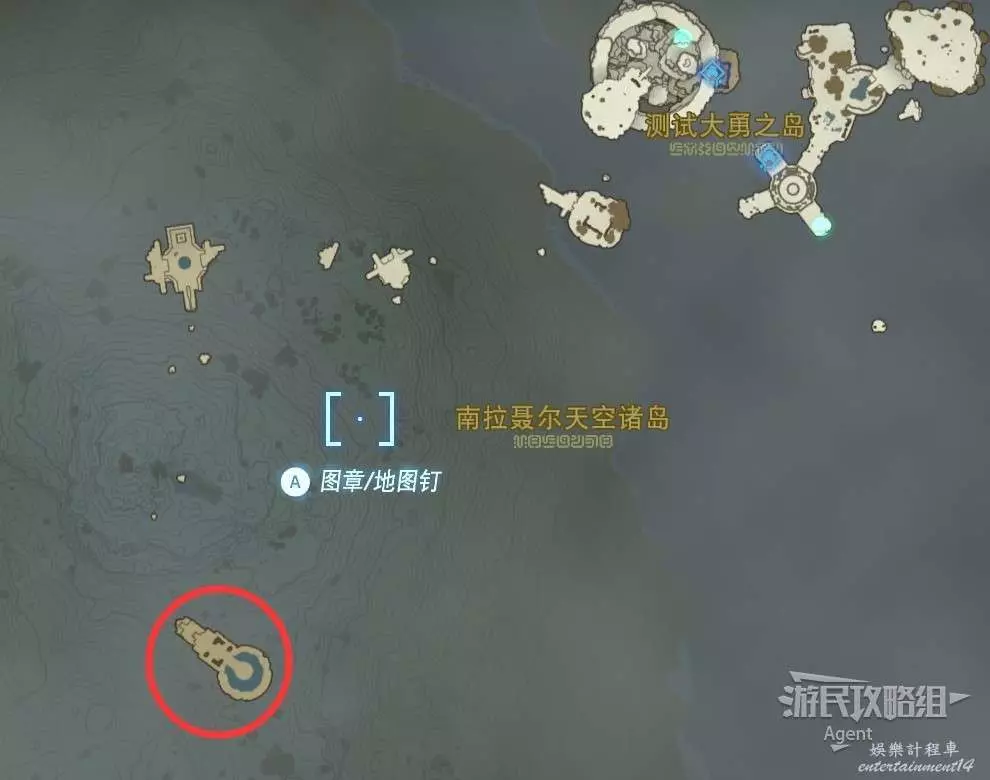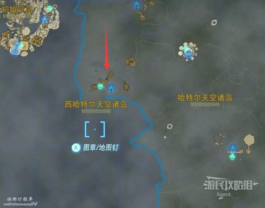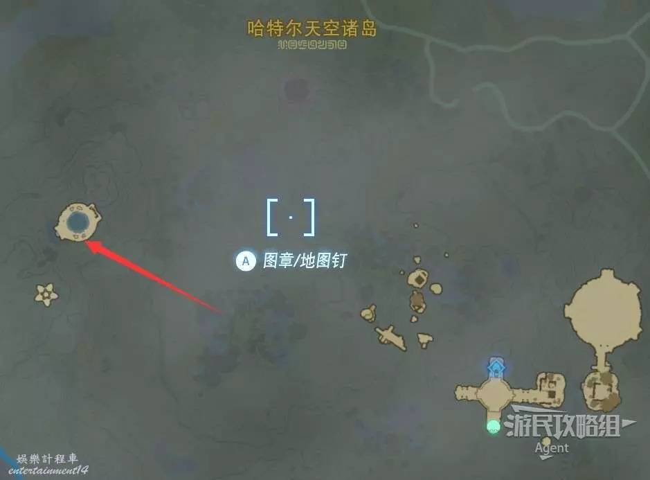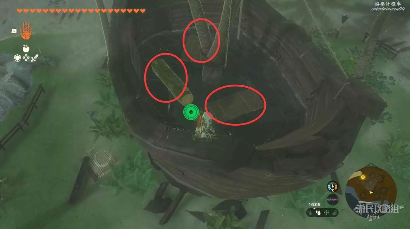 用彈射器然後用平臺上的火箭,到東北方最高島的頂部。下圖位置吊著個寶箱,往下跳空中拉弓射斷繩子,然後落下去開寶箱得到【殘舊的地圖】,在地底標出了藏特頭盔的位置。