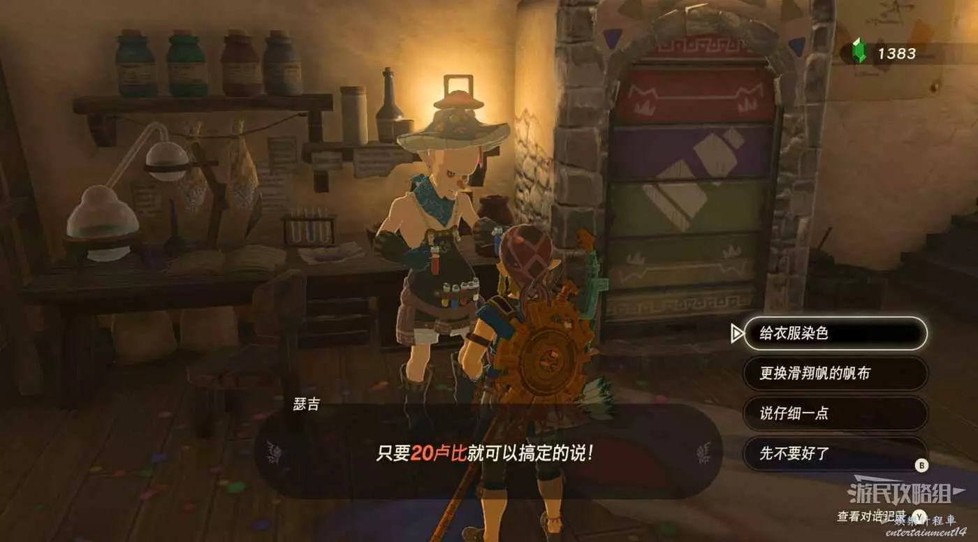 與染坊的瑟吉對話,得到【SAGONO的布料】。在染坊可以給衣服染色、更換滑翔傘布料。(海利亞套裝染成白色多像刺客信條啊!如果在沙漠格魯德小鎮的房頂一蹲,就更像啦!)