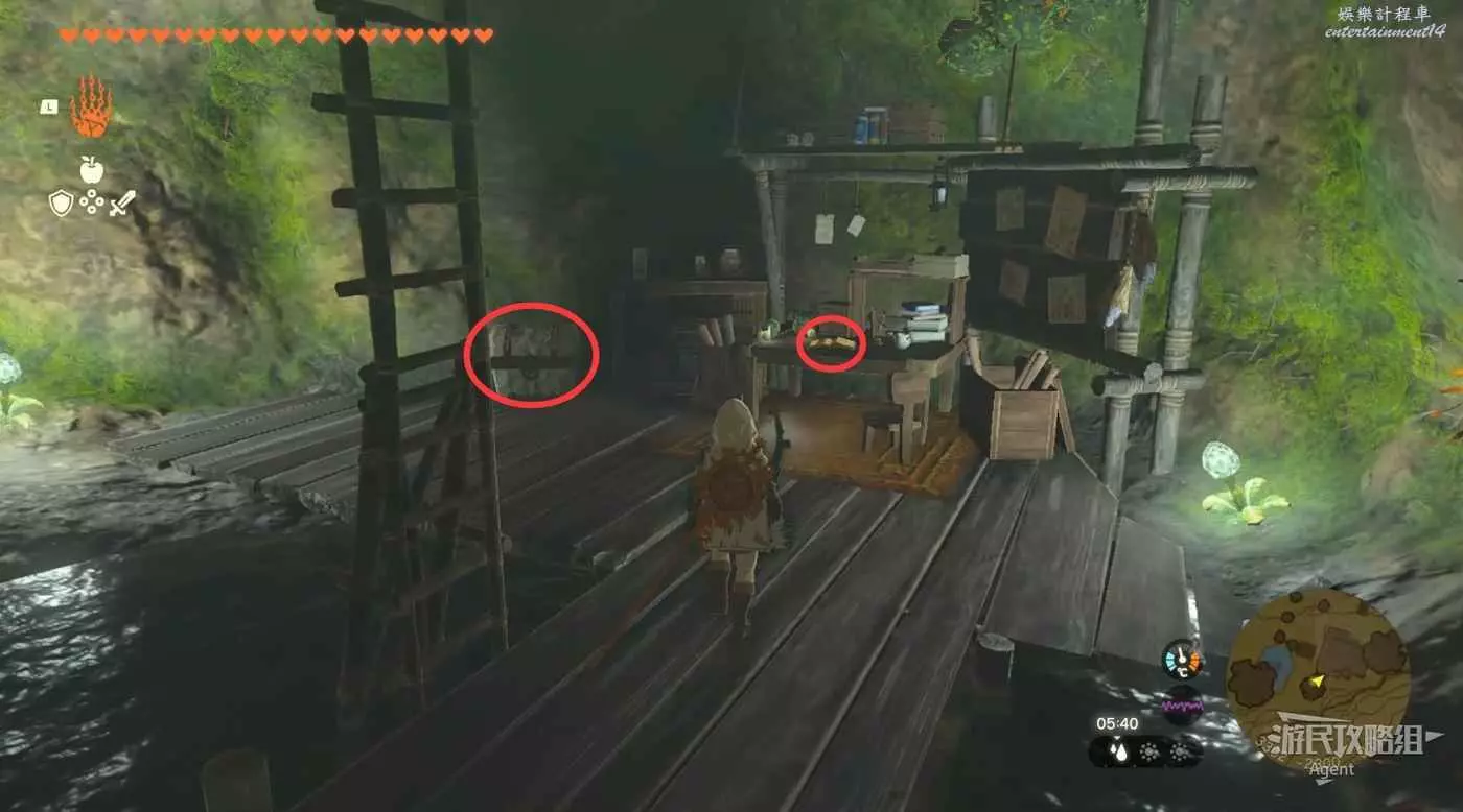 下圖位置吊著個寶箱,往下跳空中拉弓射斷繩子,然後落下去開寶箱得到【殘舊的地圖】,在地底標出了米多娜的王冠的位置。