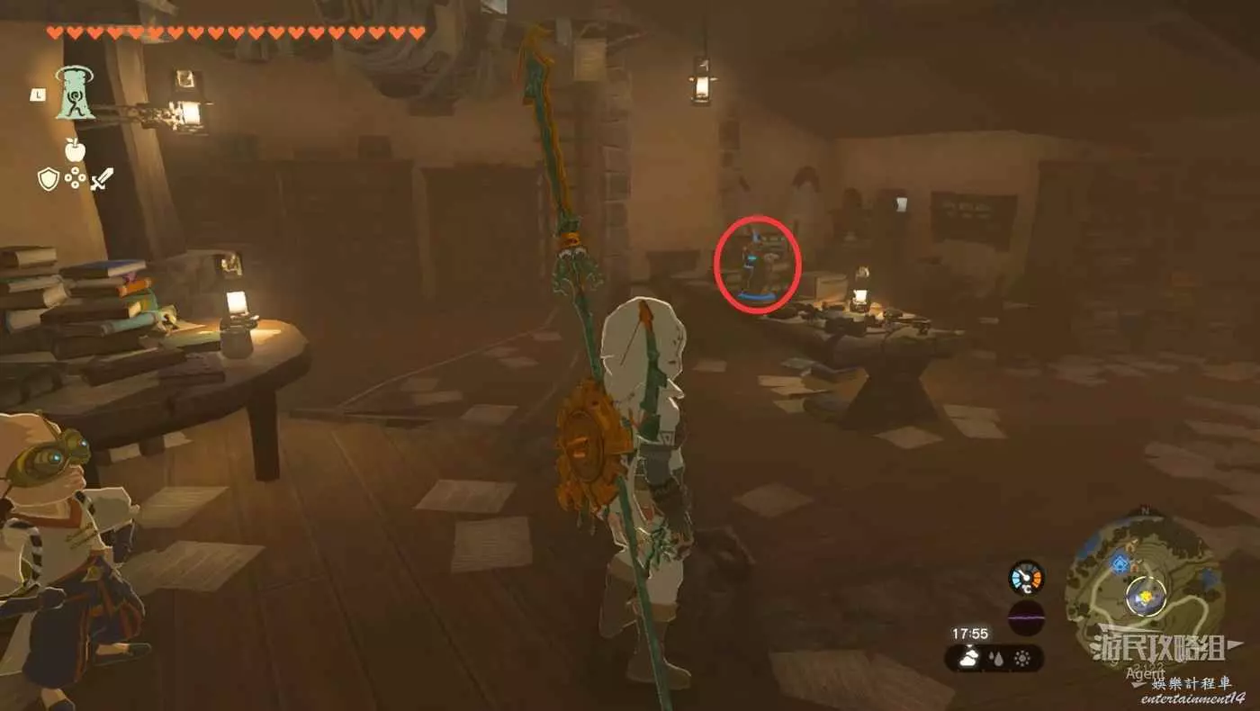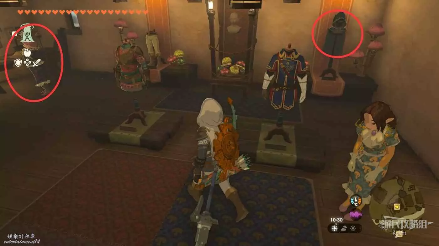 井裡開寶箱得到【防具】殘舊的髮夾。閱讀桌上的日記接到【迷你挑戰】新的英傑服,得知塞爾達為林克定制了新的英傑服,藏在王座之室。