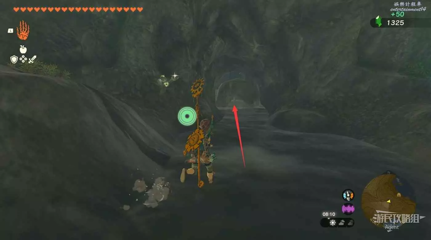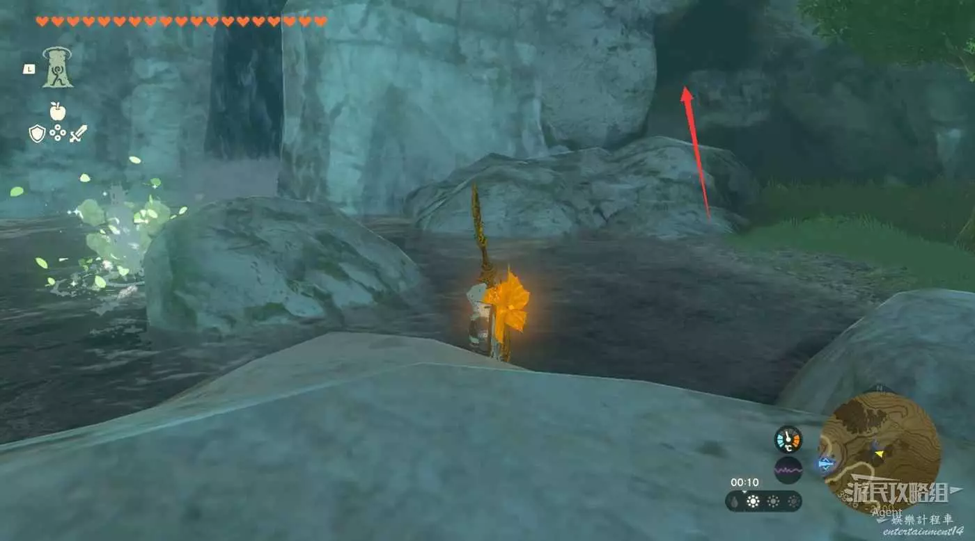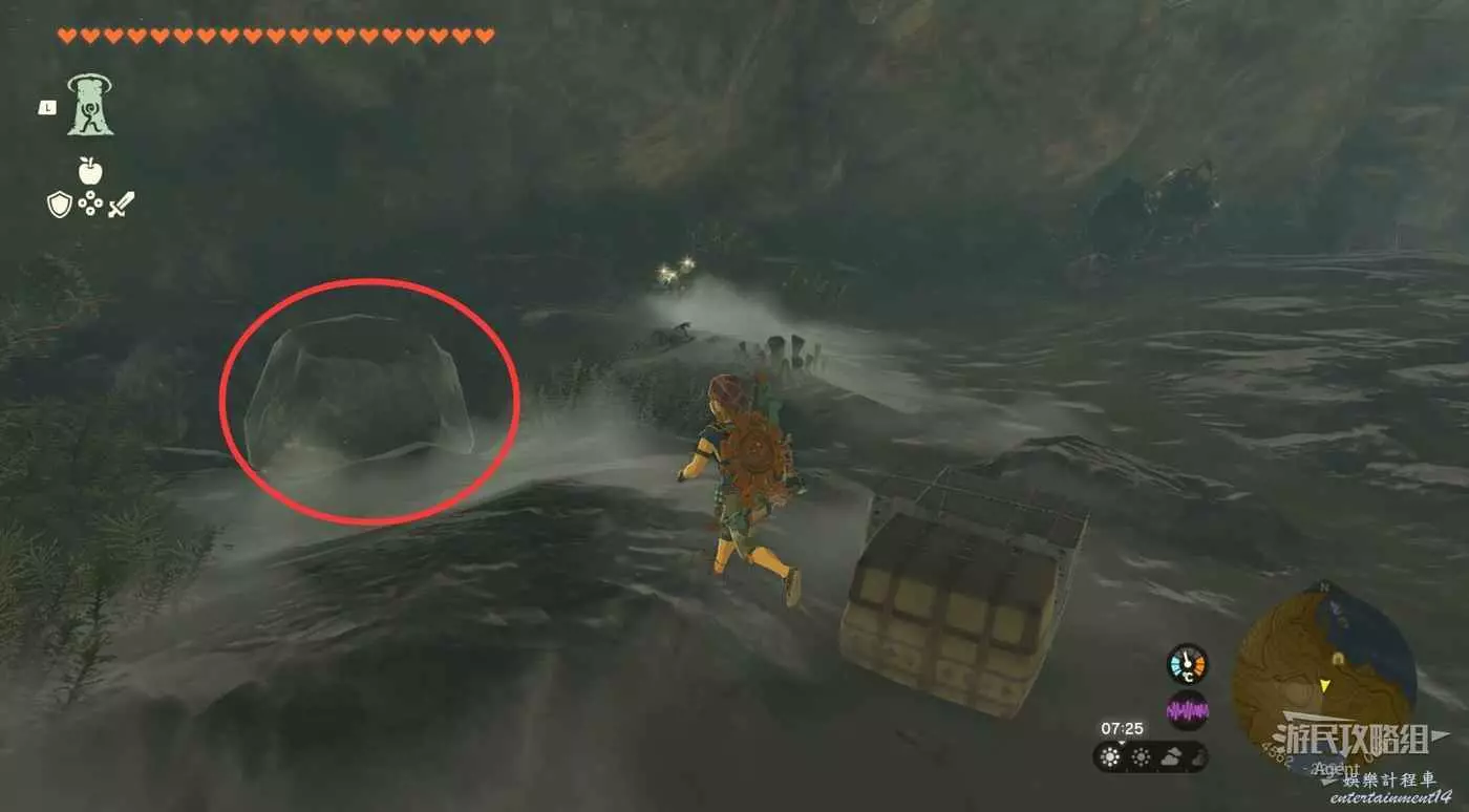 扛著水晶往前走,注意躲避滾石。前面下去有個洞,進洞左拐遊過積水有發光青蛙,進洞右拐走上坡發現神廟。