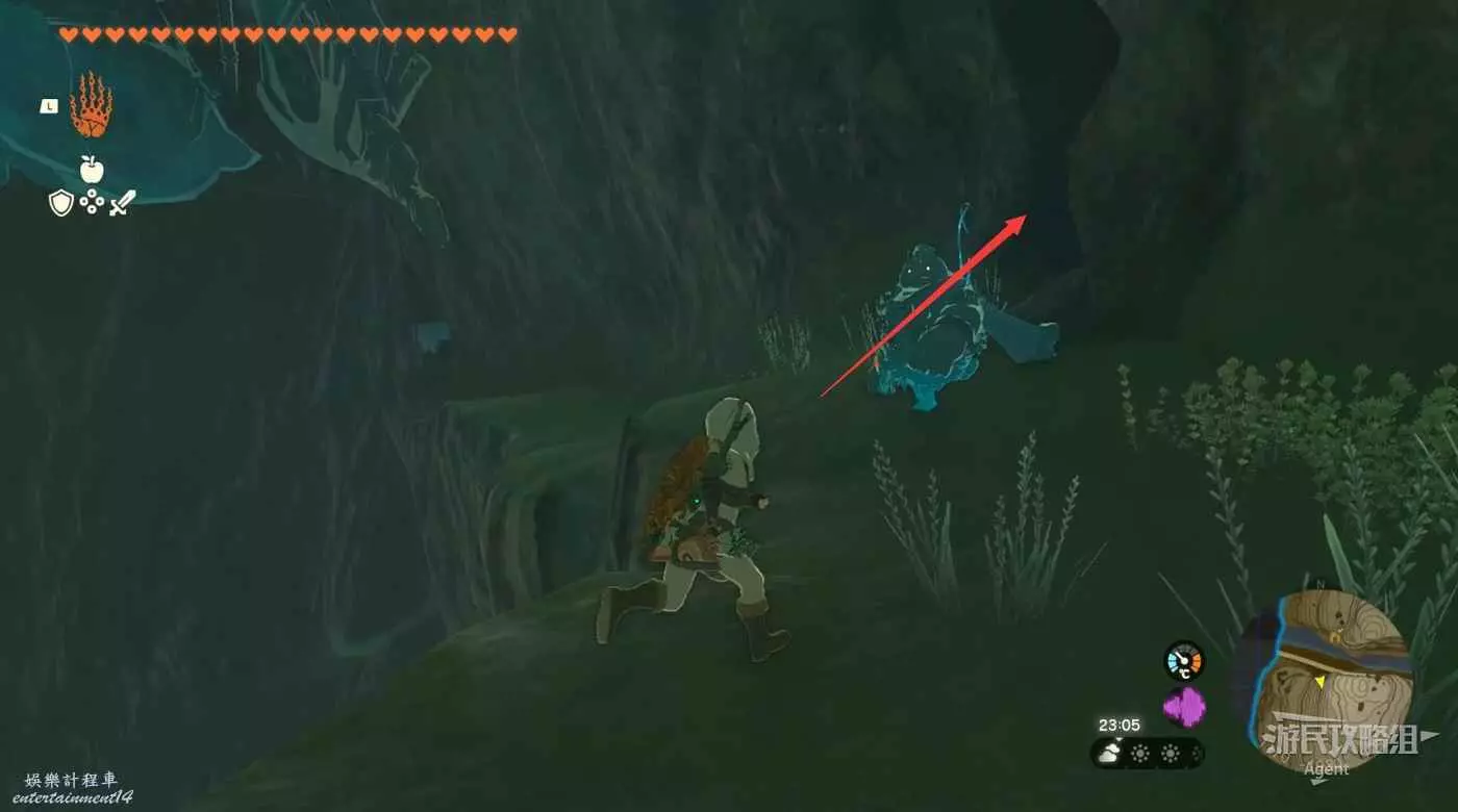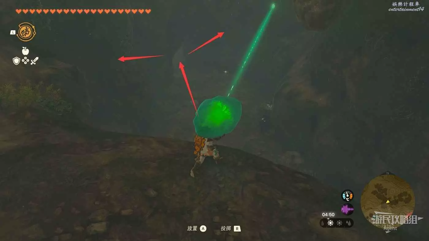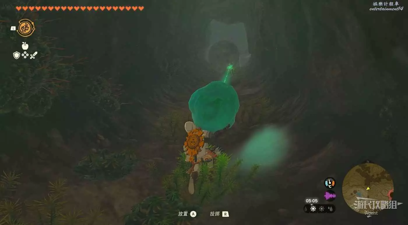扛著水晶往前走,注意躲避滾石。前面下去有個洞,進洞左拐遊過積水有發光青蛙,進洞右拐走上坡發現神廟。