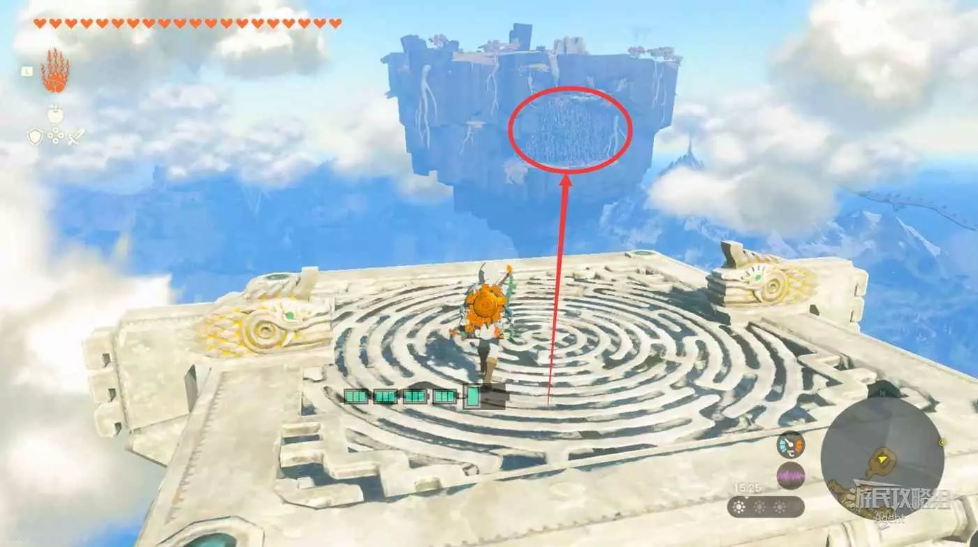 向東面的群島滑翔,然後用通天術、彈簧抵達十字形島。島上有左納烏裝置製造機,觸摸神廟接到【神廟挑戰】哈特爾天空諸島的神廟與水晶。