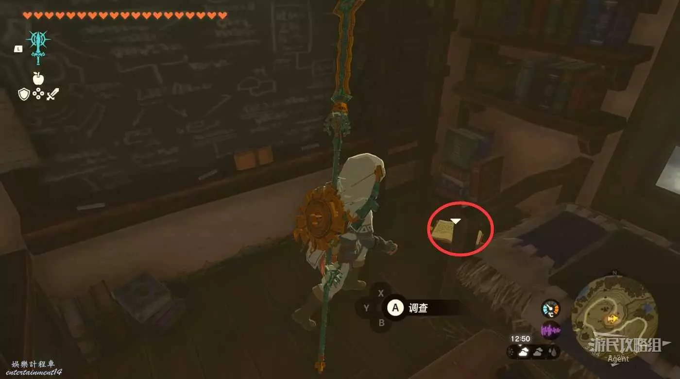 來到阿卡萊古代研究所,日記在書架上,林克太矮了夠不著,要站在箱子上看。