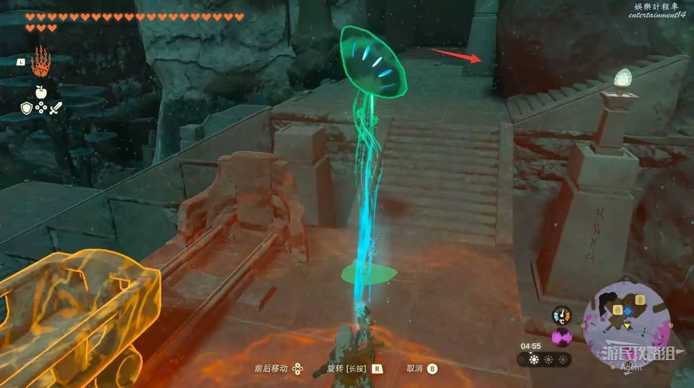 先把礦車移到軌道偏中間的位置,然後用通天術上到礦車上,用究極手拿牆邊的寶箱。
