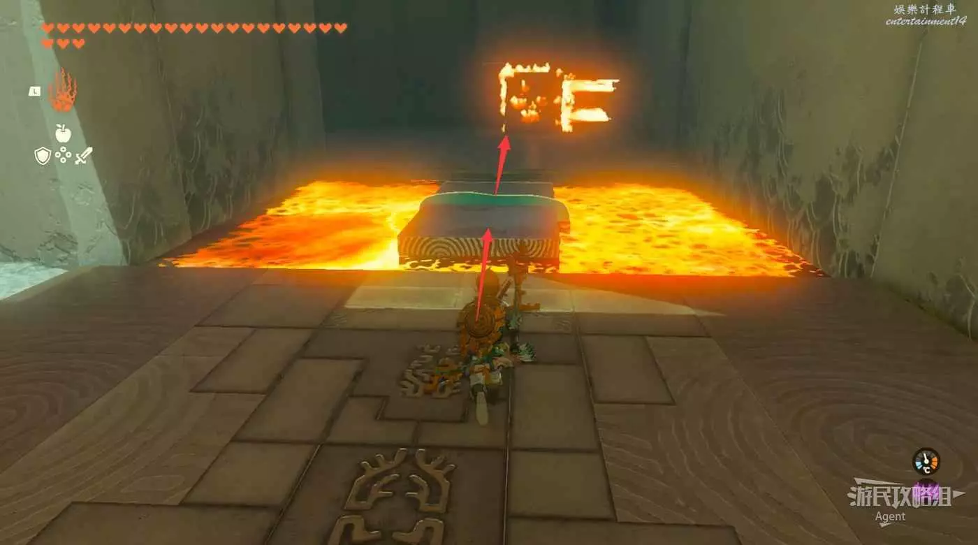 根據上圖三個方塊鑰匙孔來燒冰塊,使三個冰塊都能剛好放進鑰匙孔裡,神廟就會出現在頭頂,用通天術上去。