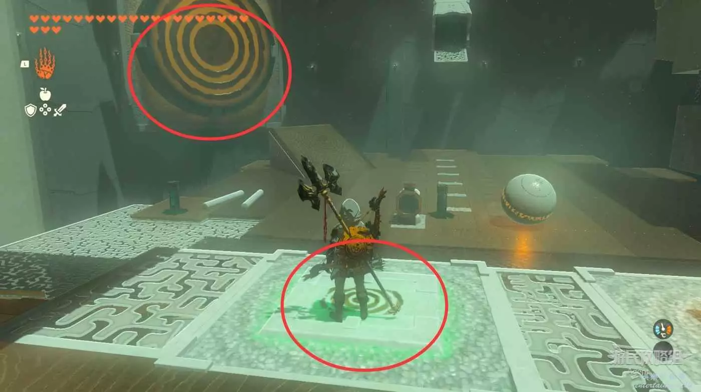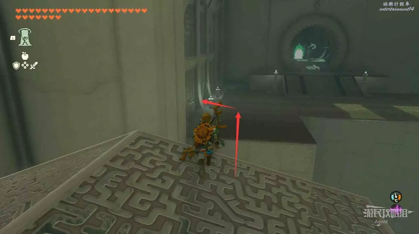 左側有個寶箱關在門後面,只需用究極手把寶箱放到機關上壓住,門就開了,就可以進去拿到寶箱。