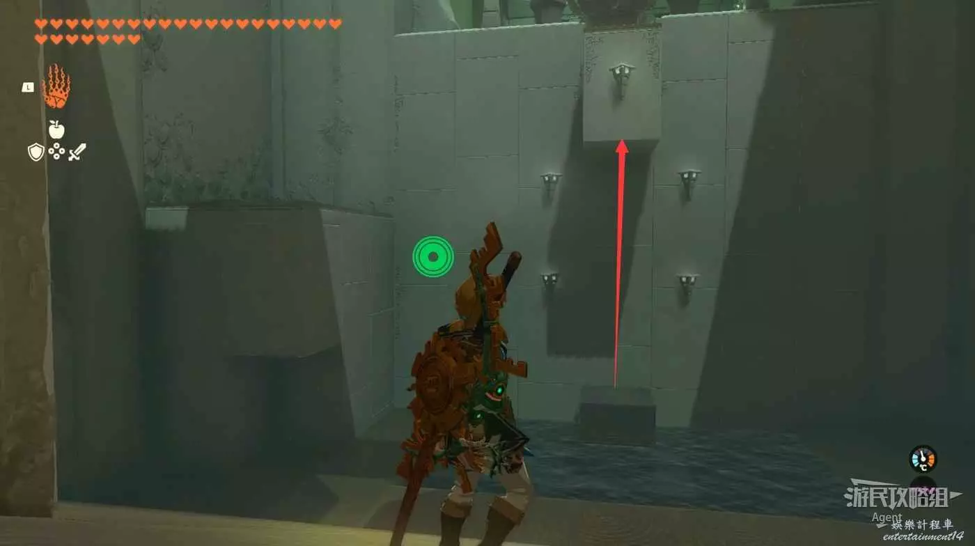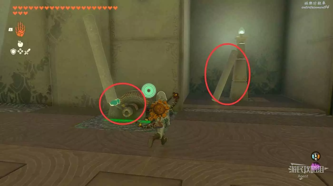 帶樁板子斜著插在牆上,拿一個樁擋住下面旋轉的石板使其保持傾斜,到高處平臺更方便用究極手移動樁的位置。