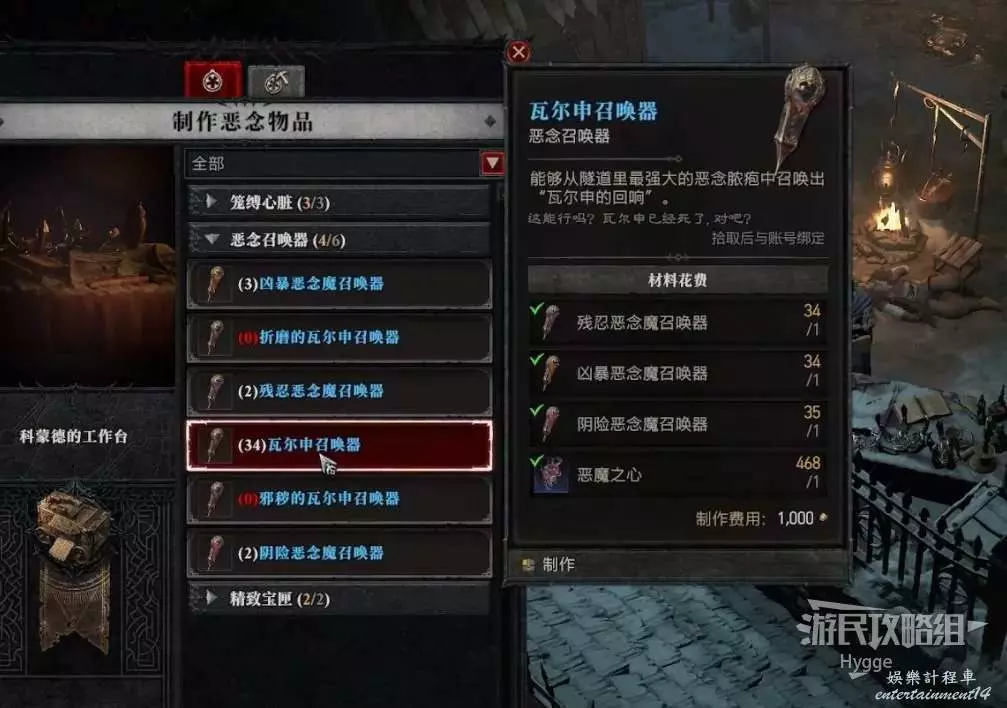 利用該圖紙製作邪穢召喚器後,將世界難度切換到層級3,再次按照之前的操作來到洞穴中召喚瓦爾申。