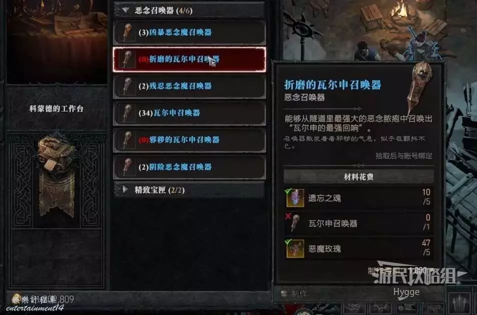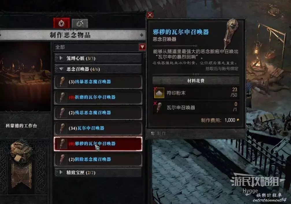 瓦爾申的召喚器共有普通、邪穢和折磨三個等級。首先完成賽季主線任務,消滅BOSS時會掉落普通的瓦爾申召喚器製作圖紙,如果沒有掉落圖紙可以將世界層級切換回2級再打一遍BOSS。