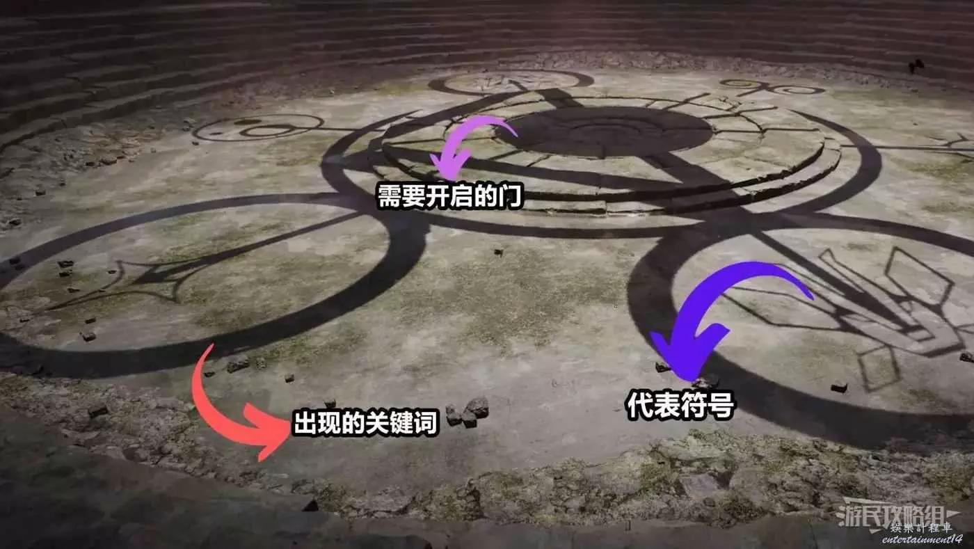 以圖書室為參照(入口附近默認開放的房間),進入圖書室可以找到一本包含神話故事的書,書裡寫明瞭謎題中的6個符號的含義(太陽、月亮、生命、死亡、紅鹿、劫掠者),翻頁之後可以查看幾扇大門的代表符號。