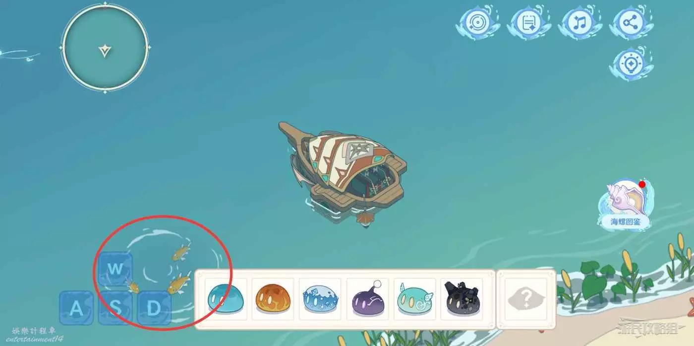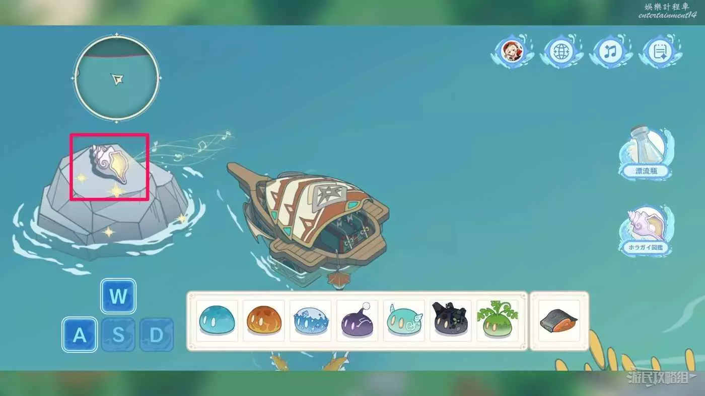 1. 先從初始位置往上走與浪船錨點互動,駕駛浪船到達魚群位置,點擊魚群獲得魚肉,繼續往前行駛收集海螺。