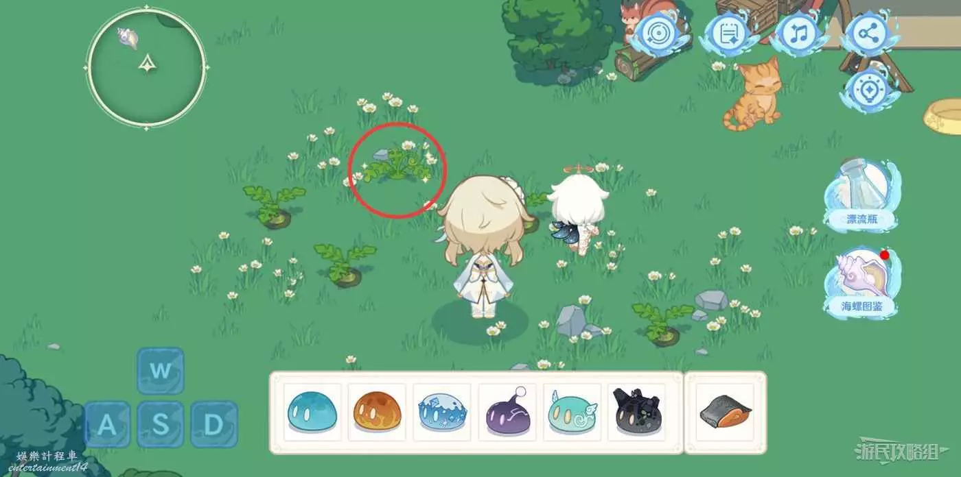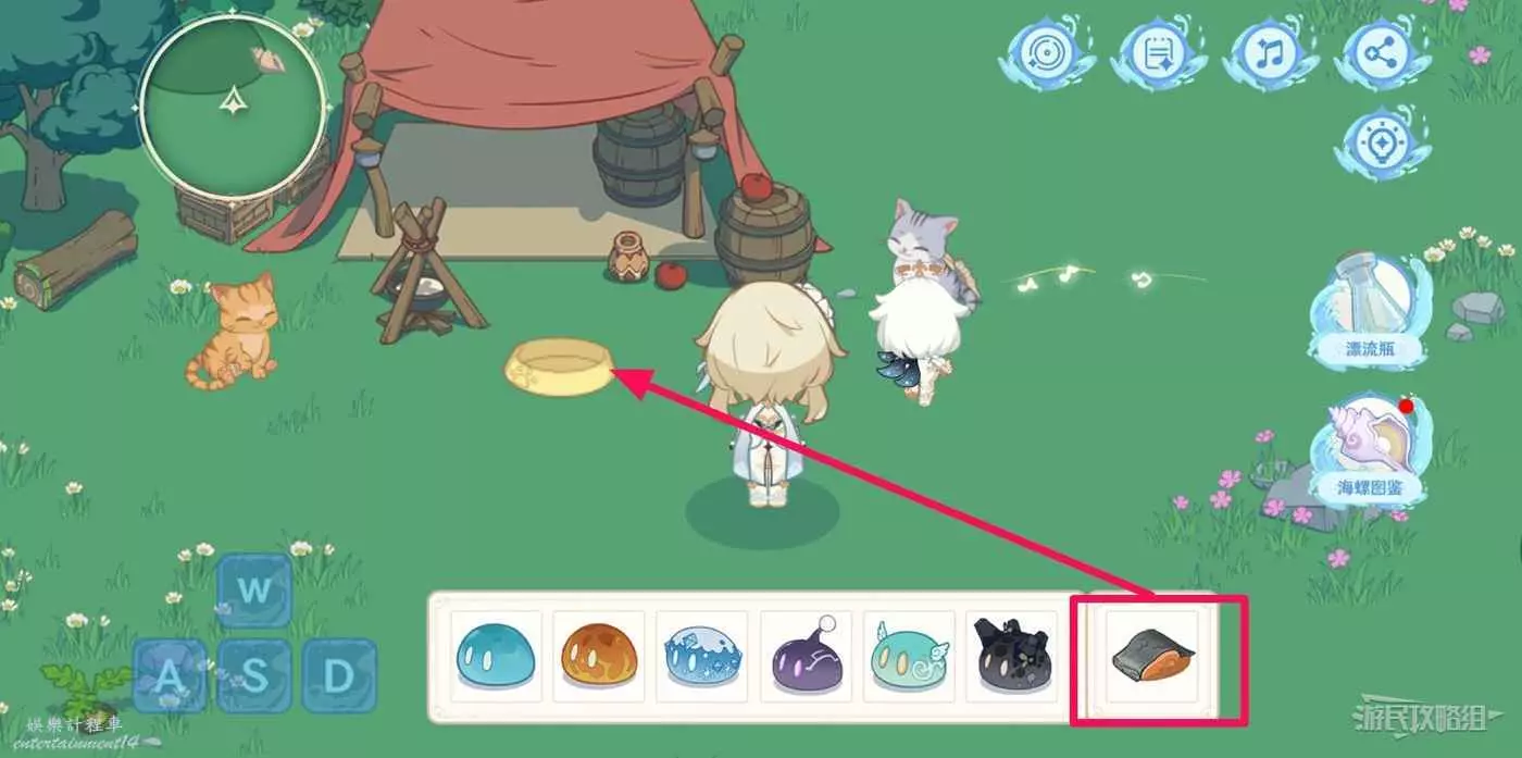 5.將之前獲得的魚肉放入貓食盆,等待貓咪過去吃,拾取海螺。
