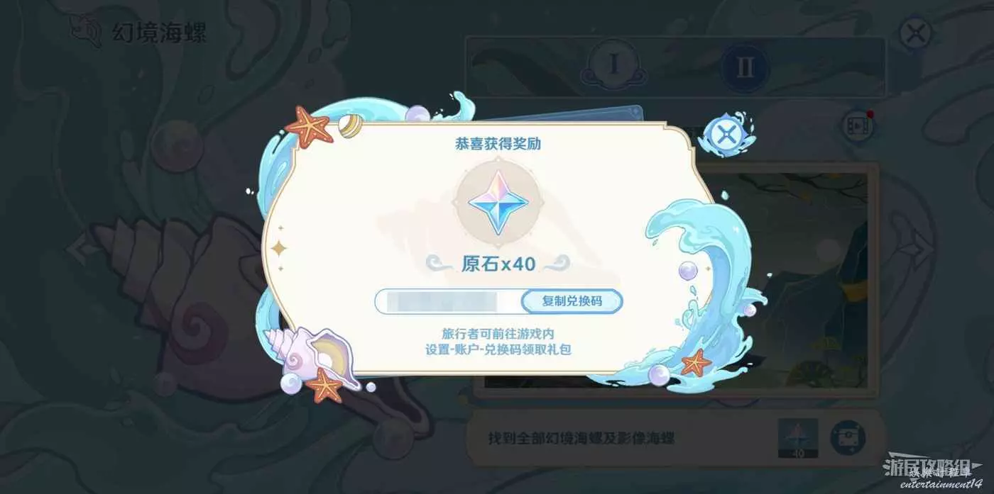 - 活動簡介:活動期間,收集全部幻境海螺與影像海螺(共5個)並分享活動,即可獲得原石兌換碼獎勵(限量500萬份);收集全部回聲海螺(共5個)即可獲得大英雄的經驗兌換碼獎勵(限量300萬份);獲得兌換碼後,旅行者可前往遊戲內「設置」-「帳戶」-「兌換碼」領取禮包