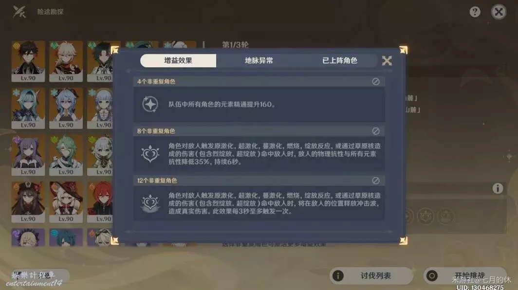 3.每輪挑戰都有1個buff,分別需要達到挑戰角色(4/8/12)不重複的條件才能啟動。對角色池深度要求比較高。