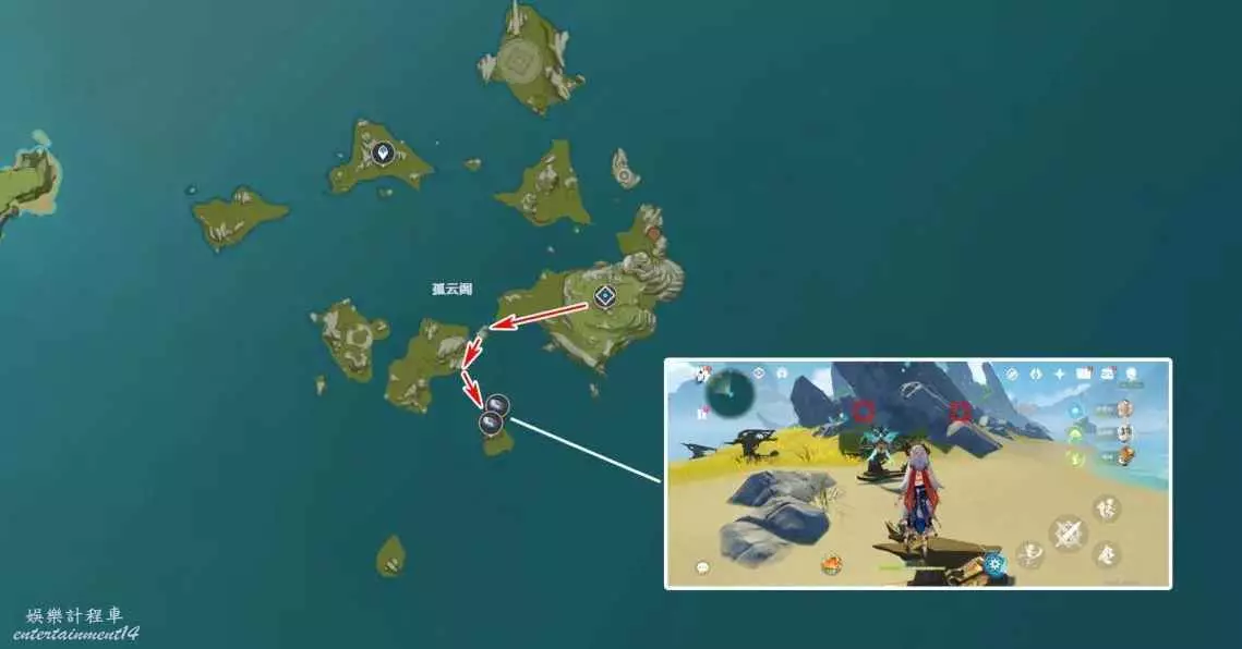 ◆孤雲閣南部小島上分佈兩個,按照下圖路線行進的話,夜泊石會在小山的背面。