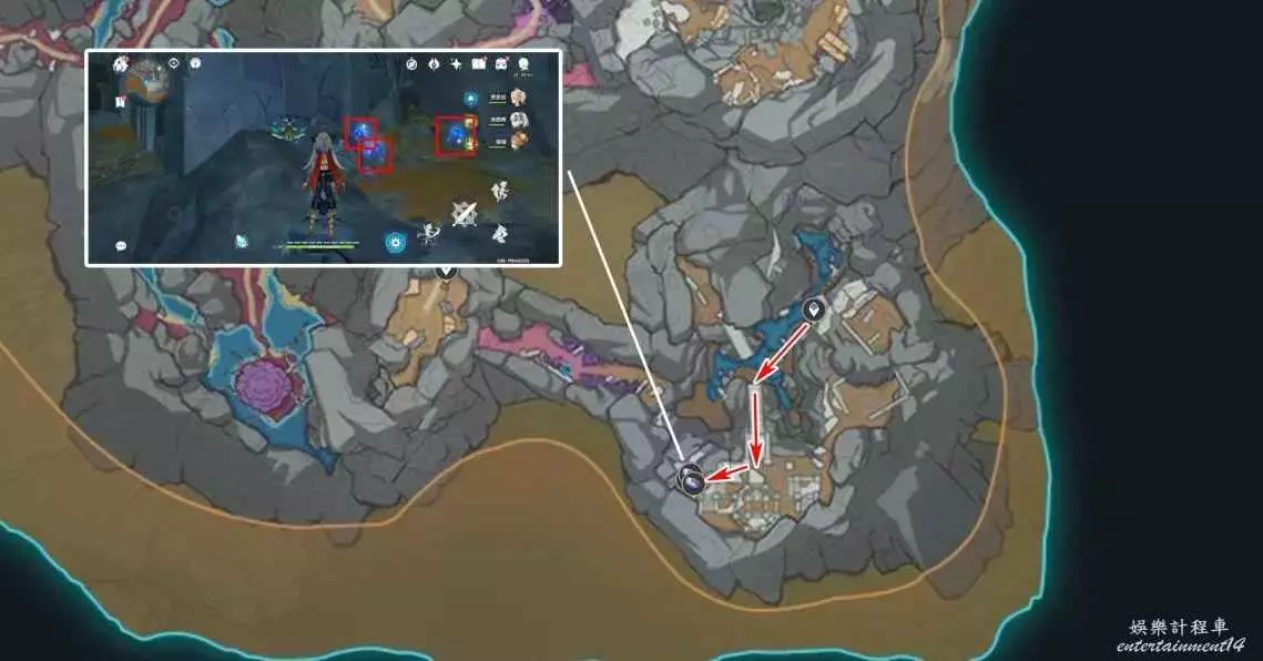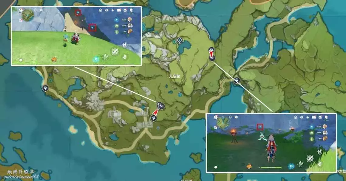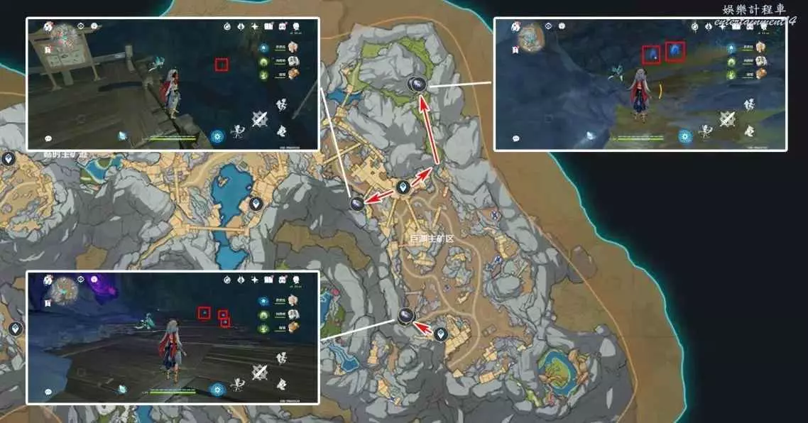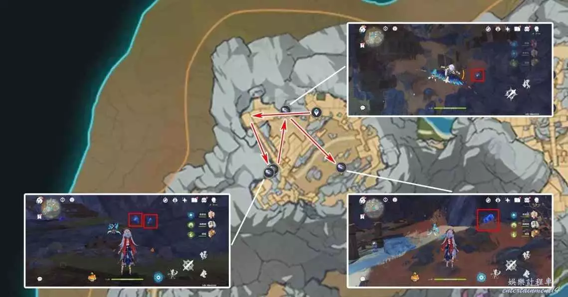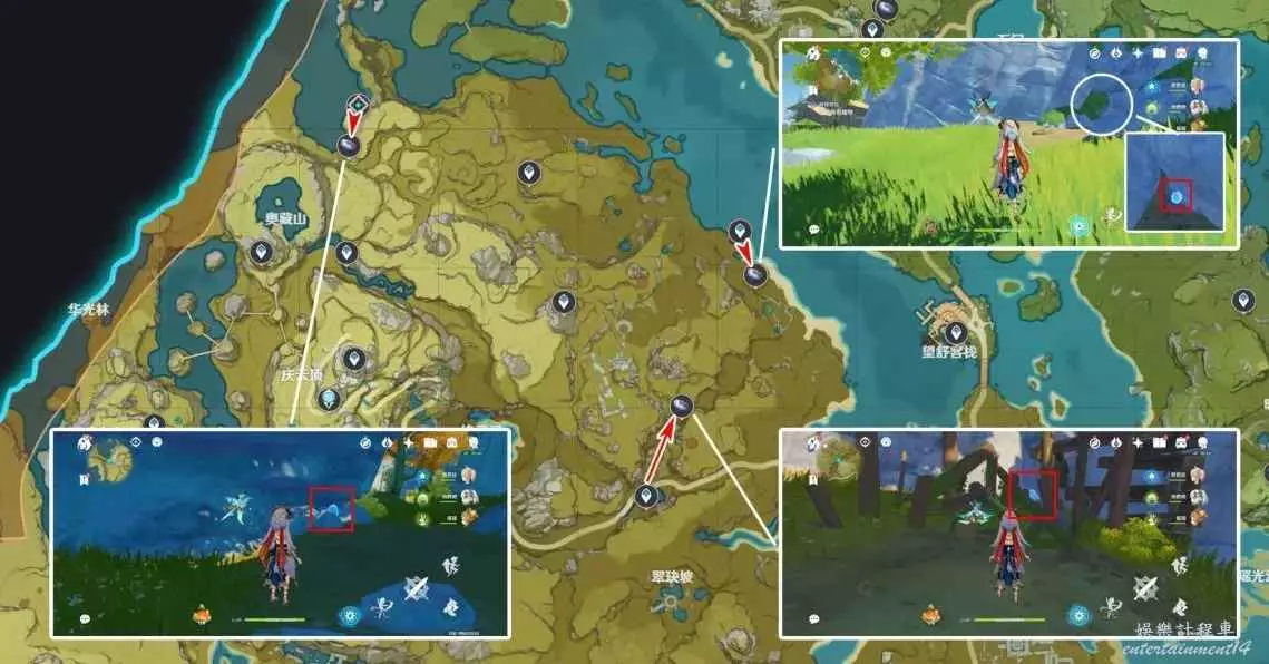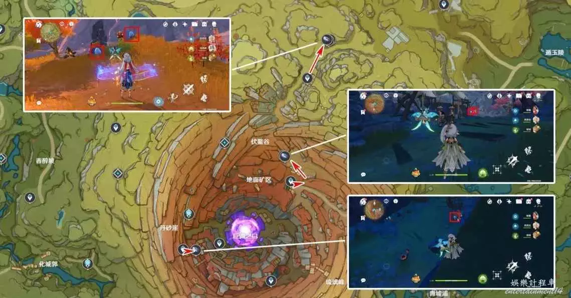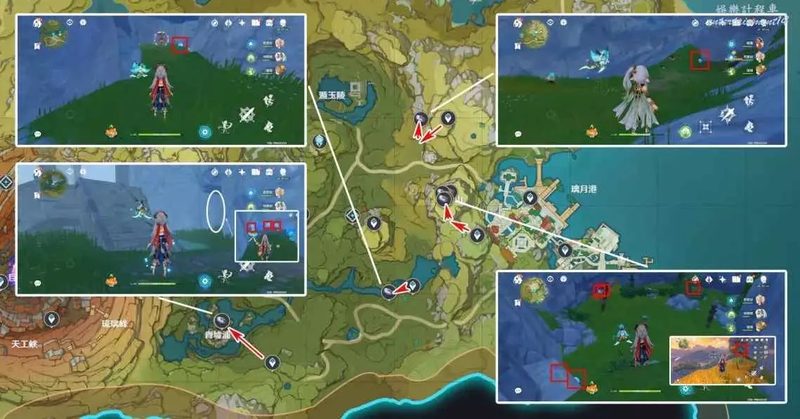◆右下圖的採集點位於天衡山內部,從有丘丘人的那裡進入。其餘三個採集點均在最低處的洞內,洞口就在採集點附近。