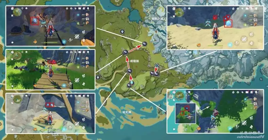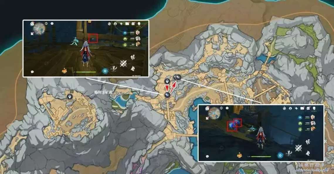 ◆採集點位置如下,分佈數量比較集中。如果你到附近找不到,可能被堵住,開元素視野擊破阻擋的東西就行。