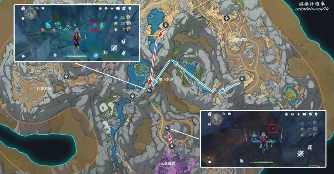 ◆無名遺跡可在傳送點飛下,距離很近;地下水澤沿著紅線行進最近,如果這裡的洞口你沒打開,就走藍色線路,這裡不推薦過去,太遠了。