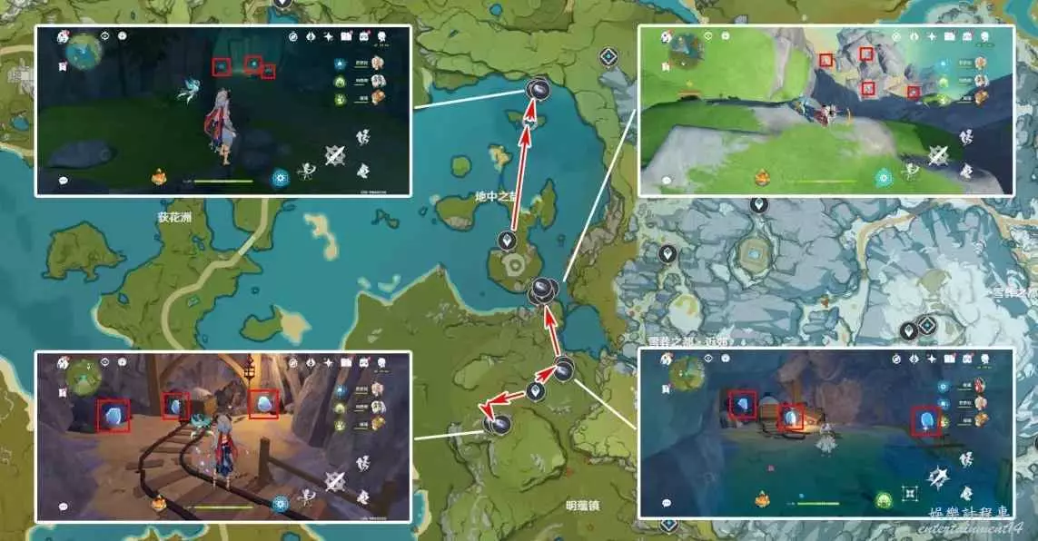 ◆按照下圖路線行進,切記第一處位於高出,通過傳送點旁邊的棧道過去。第二、第三採集點位於地面上,先後順序可顛倒。