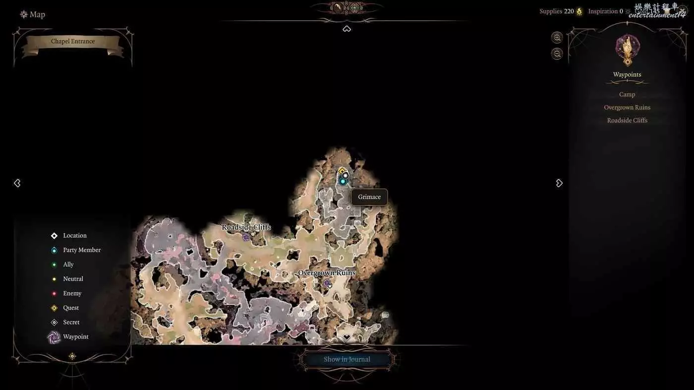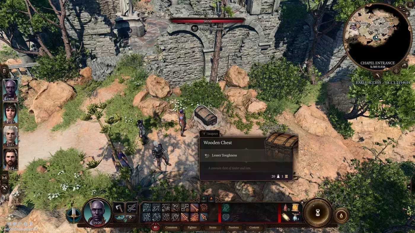 拾取鏟子後轉身走出大門來到廢墟右側週邊,感知足夠高時可以看到地上有個土堆,用鏟子挖掘即可。如果感知不夠的話建議在墜毀的地獄螺殼艦附近找到並招募阿斯代倫,他的感知能力很強,經常能發現隱藏的寶藏和陷阱。