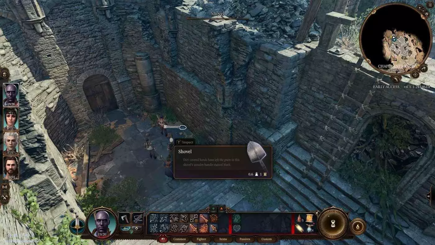 到達上述位置後會遇到一些尋寶者,要麼遊說他們離開,要麼殺死他們,做出任意選擇後即可自由探索廢墟。往下走到廢墟內的入口,門右側地板上可以拾取到鏟子。這是本作中能找到的第一把鏟子,拿到之後即可通過感知來檢查土堆。
