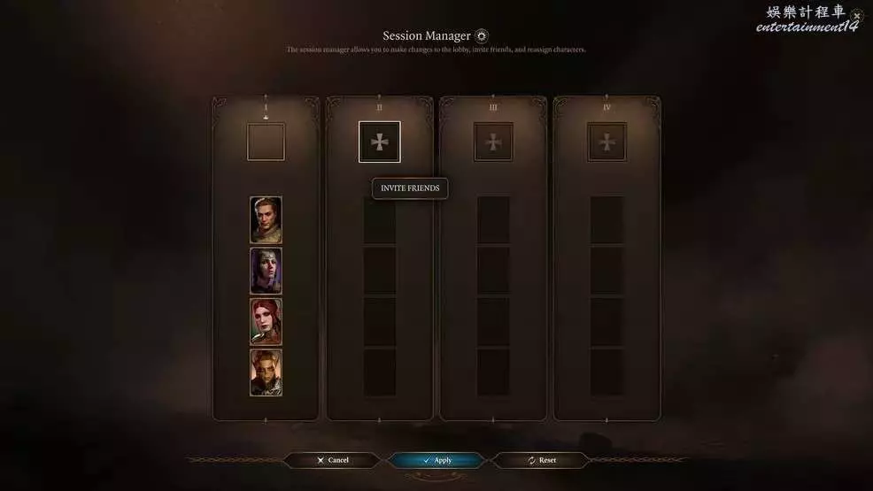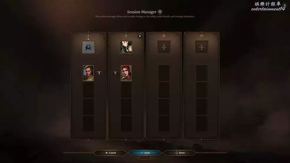 讀取多人遊戲存檔並邀請所有好友後,可以為好友分配角色,點擊每個角色頭像旁邊的箭頭即可移動角色,但無法分配當前正在控制的角色。