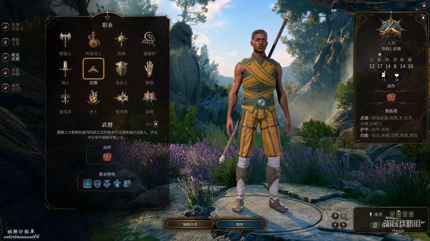 武僧在前期就可以使用兩種獨特的機制,分別是“氣”和“武藝”。使用武藝時不可以裝備任何的護甲和盾牌,僅使用徒手或規定範圍內的簡易武器戰鬥。達成要求後可以用敏捷來代替力量進行加成。武藝可以用自帶的傷害值來進行結算,角色等級越高武藝傷害也就越高。同時武僧的附贈動作可以額外進行一次徒手攻擊。