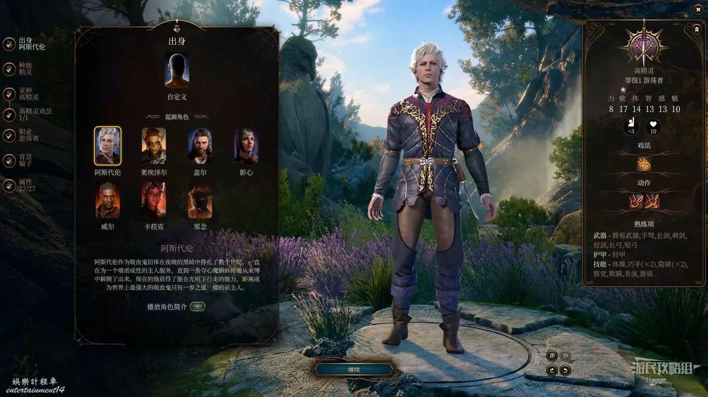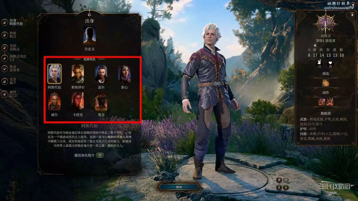 起源角色中的阿斯代倫就是一名遊蕩者職業的角色,該職業的角色在進行開鎖、偷竊和欺瞞等活動時相比其他職業更具有優勢。遊蕩者在戰鬥中可以讓攻擊造成偷襲的效果,使傷害獲得提升。