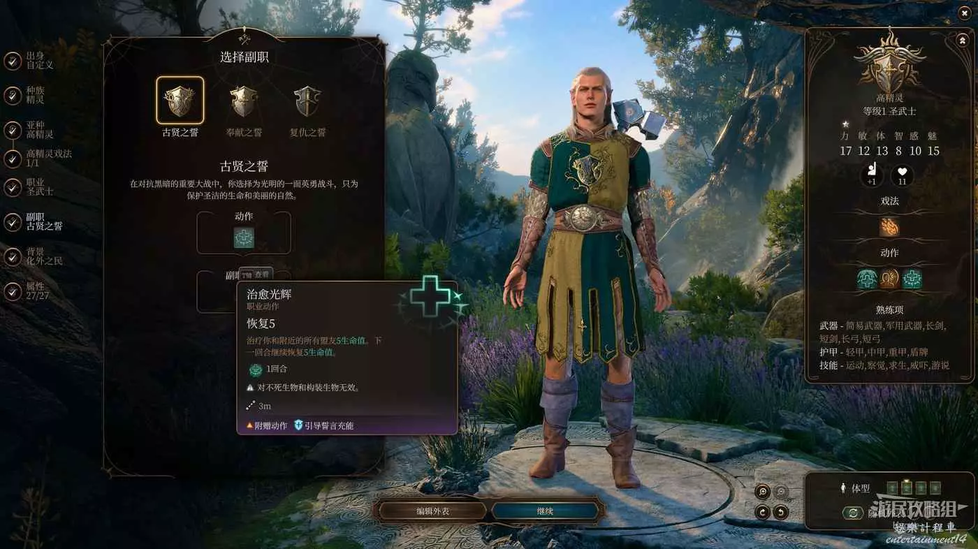 聖武士的副職業分為【古賢之誓】、【奉獻之誓】和【復仇之誓】三種,這裡重點強調並且推薦選擇【古賢之誓】。古賢之誓專屬動作【治癒光輝】能夠提供兩個回合的群體的恢復效果,具體數值由魅力調整值*等級計算得出,總恢復量十分誇張。動作位短休一次就能恢復,基本上隊伍裡帶個古賢聖武士其他人相死都難。